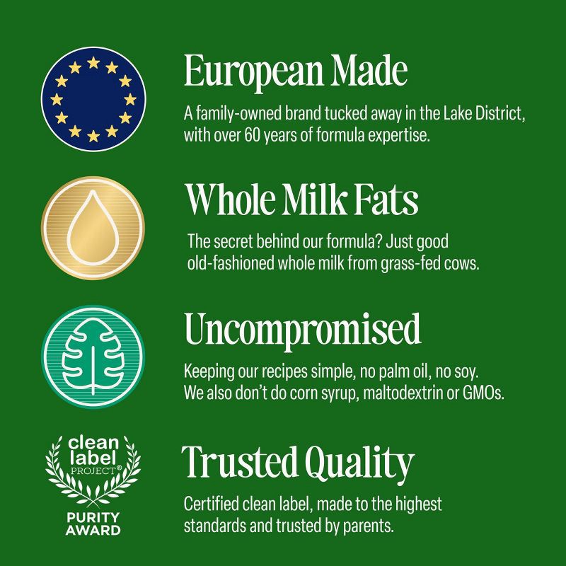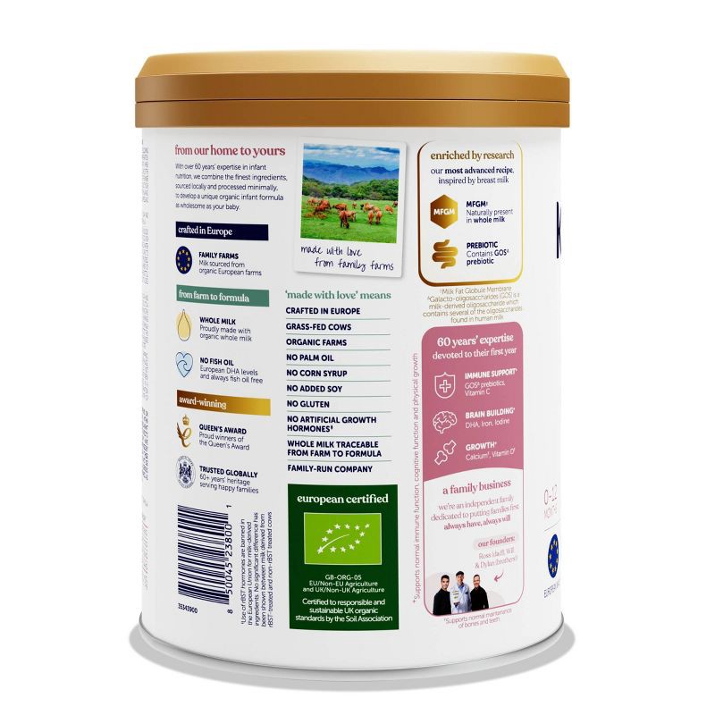 - EUROPEAN CERTIFIED ORGANIC: Organic whole milk certified by the European Union Organic Certification and the UK Soil Association - meeting both stringent animal welfare and nutritional standards. No GMOs, pesticides, or herbicides.