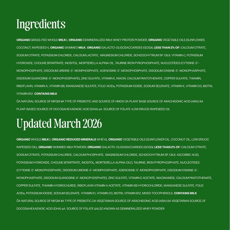 ORGANIC WHOLE MILKº, ORGANIC REDUCED MINERALS WHEY^, ORGANIC VEGETABLE OILS (SUNFLOWER OIL, COCONUT OIL, LOW ERUCIC ACID RAPESEED OIL), ORGANIC SKIMMED MILK POWDER, ORGANIC GALACTO-OLIGOSACCHARIDES (G…