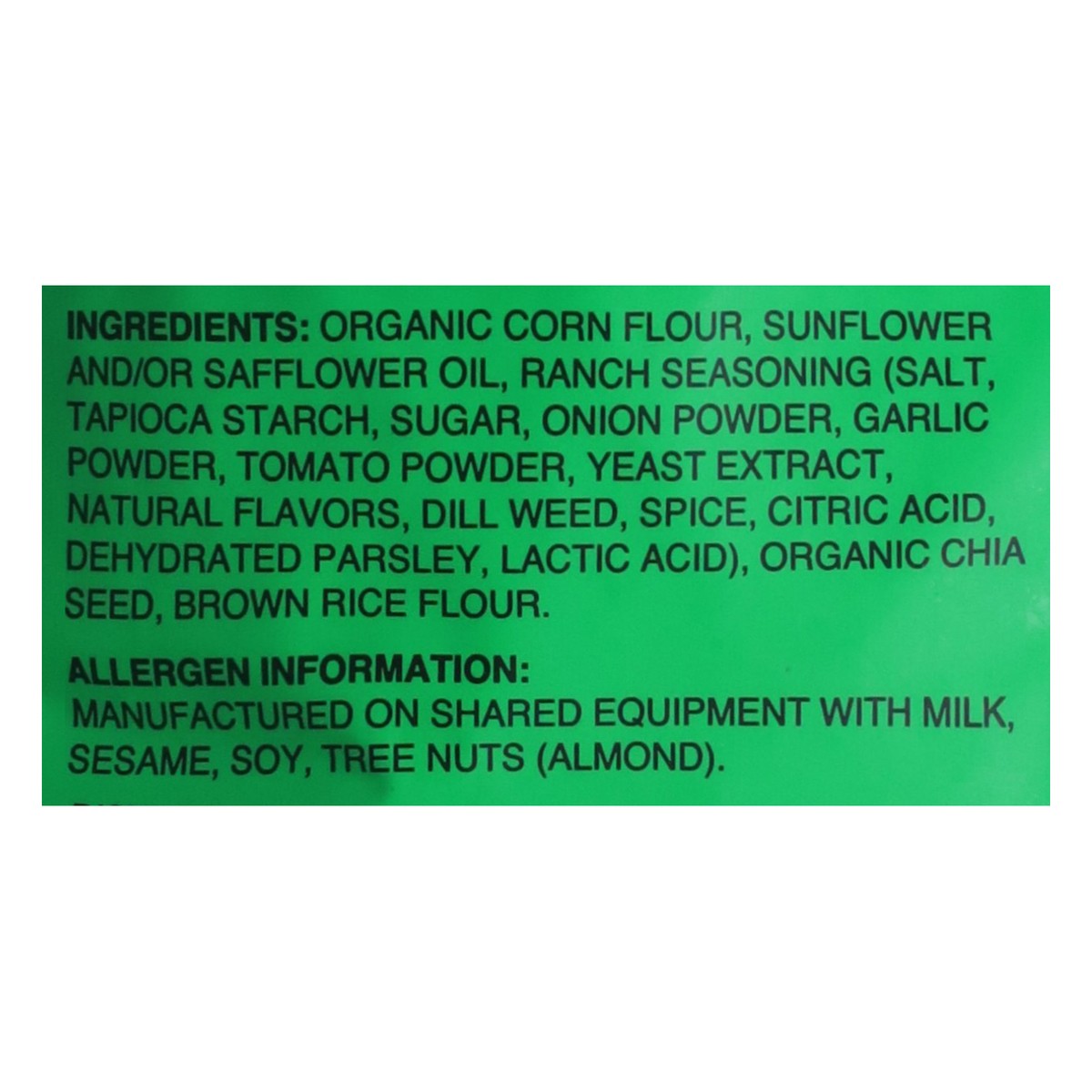 Organic Corn Flour, Sunflower and/or Safflower Oil, Ranch Seasoning (Salt, Tapioca Starch, Sugar, Onion Powder, Garlic Powder, Tomato Powder, Yeast Extract, Natural Flavors, Dill Weed, Spice, Citric A…
