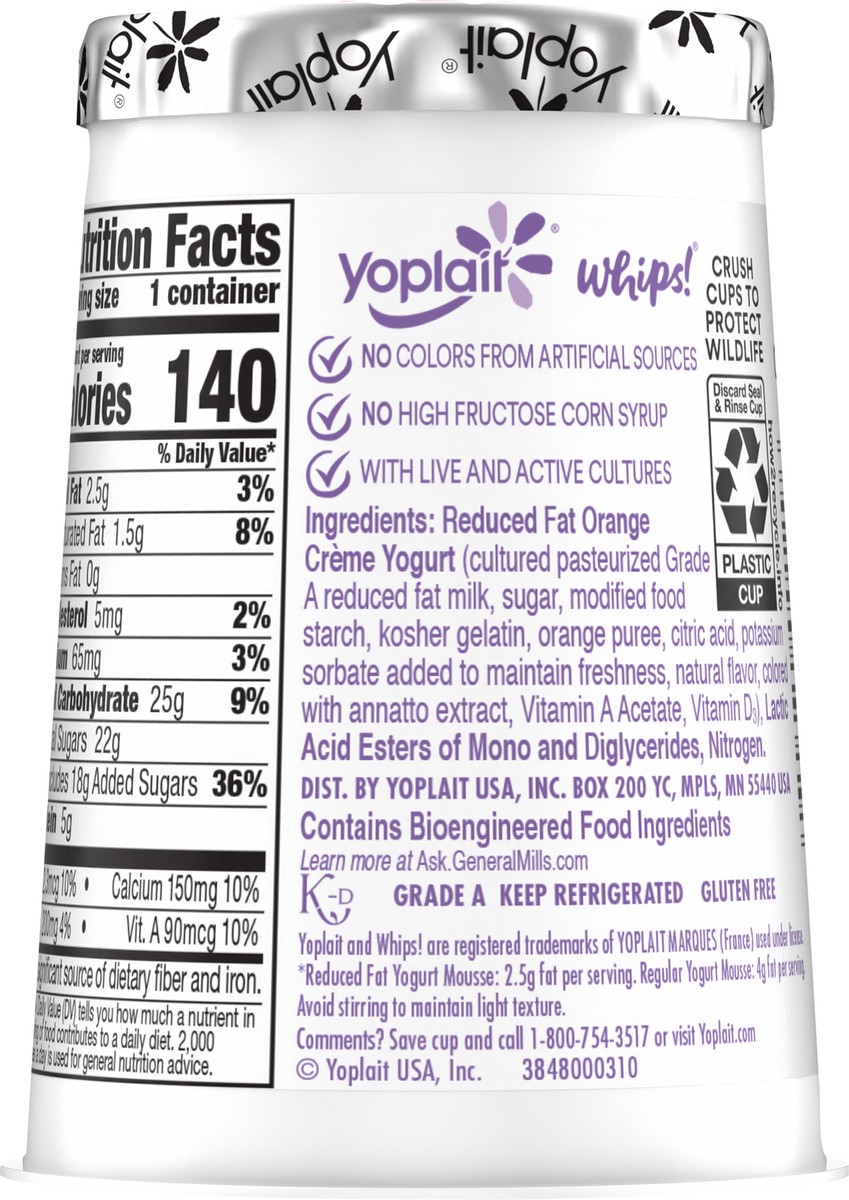 Yoplait Whips Lowfat Yogurt Mousse, Orange Creme Flavored, Gluten Free Snack, 4 OZ Yogurt Cup