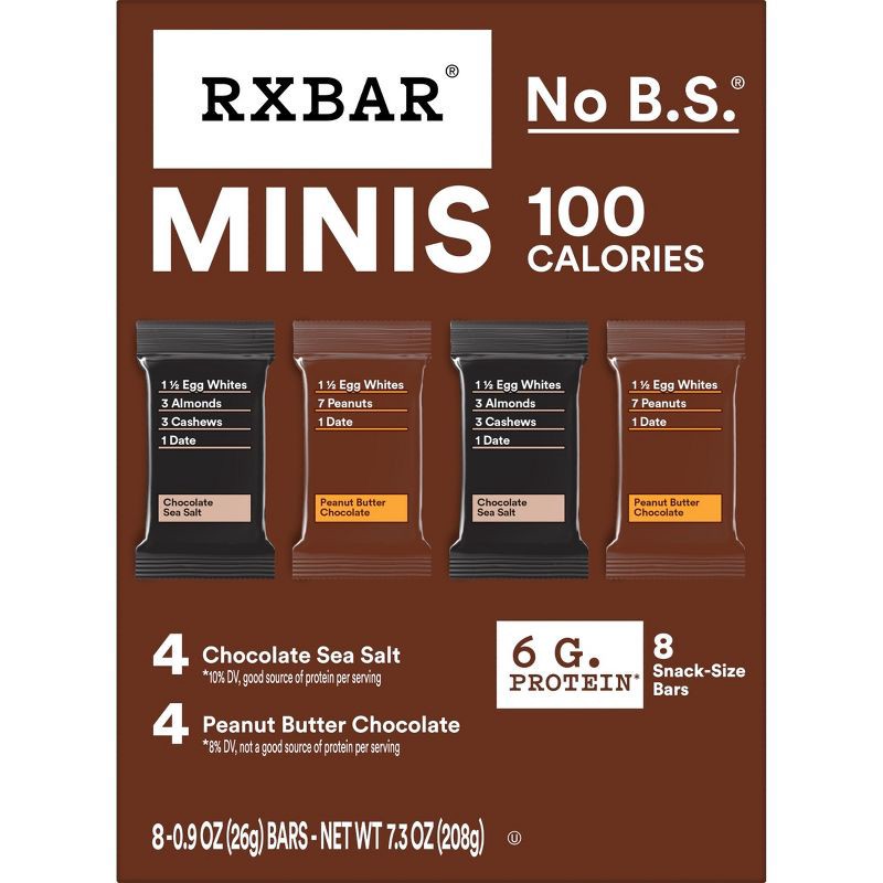 - Mini protein bars made with simple ingredients; 100 calories per serving; Includes RXBAR Chocolate Sea Salt and RXBAR Peanut Butter Chocolate