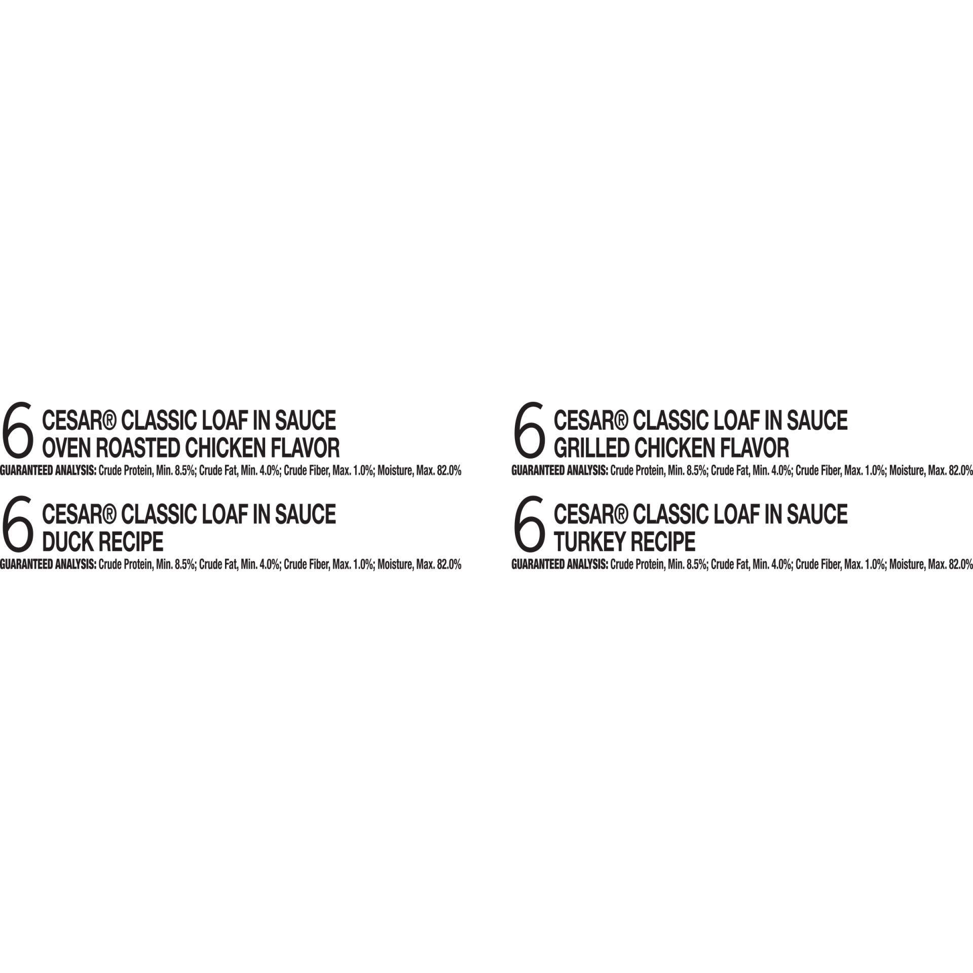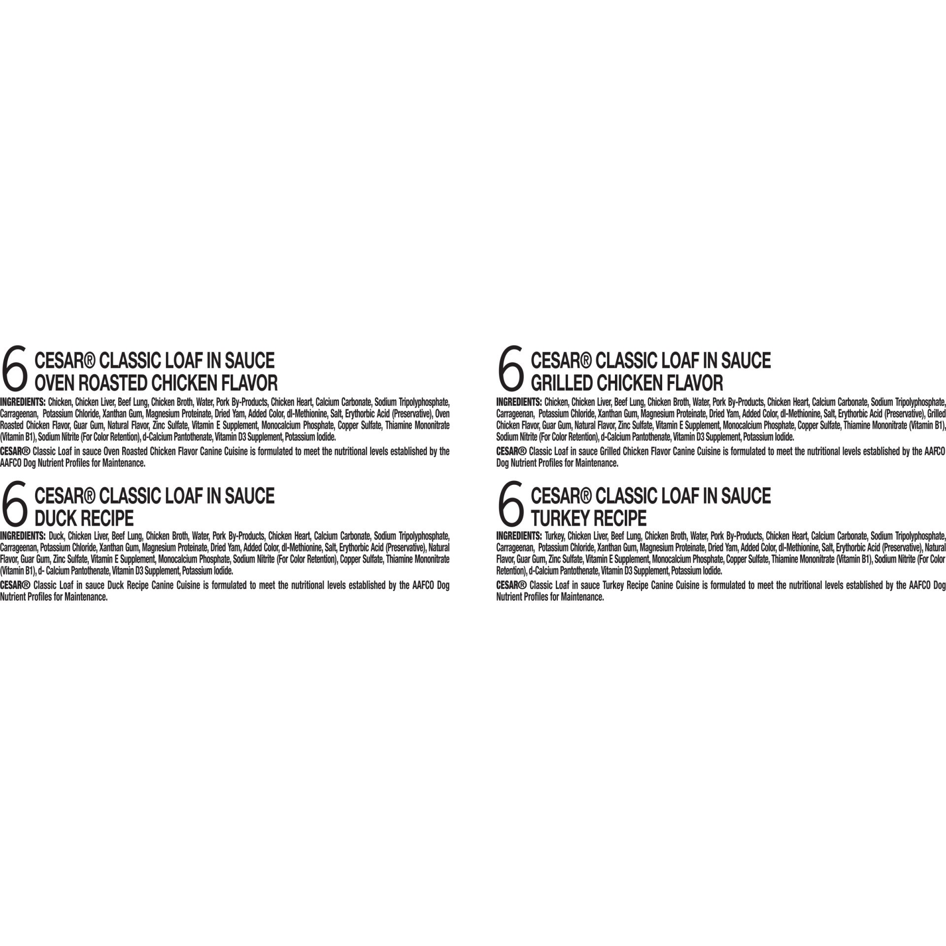 Cesar Classic Loaf in Sauce Grilled Chicken Flavor: Chicken, Beef Lung, Chicken Liver, Chicken Broth, Water, Pork By-Products, Chicken Heart, Calcium Carbonate, Sodium Tripolyphosphate, Carrageenan, P…