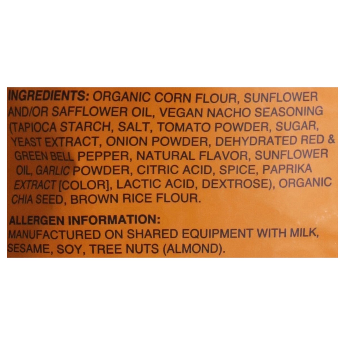 Organic Corn Flour, Sunflower and/or Safflower Oil, Vegan Nacho Seasoning (Tapioca Starch, Salt, Tomato Powder, Sugar, Yeast Extract, Onion Powder, Dehydrated Red & Green Bell Pepper, Natural Flavor, …