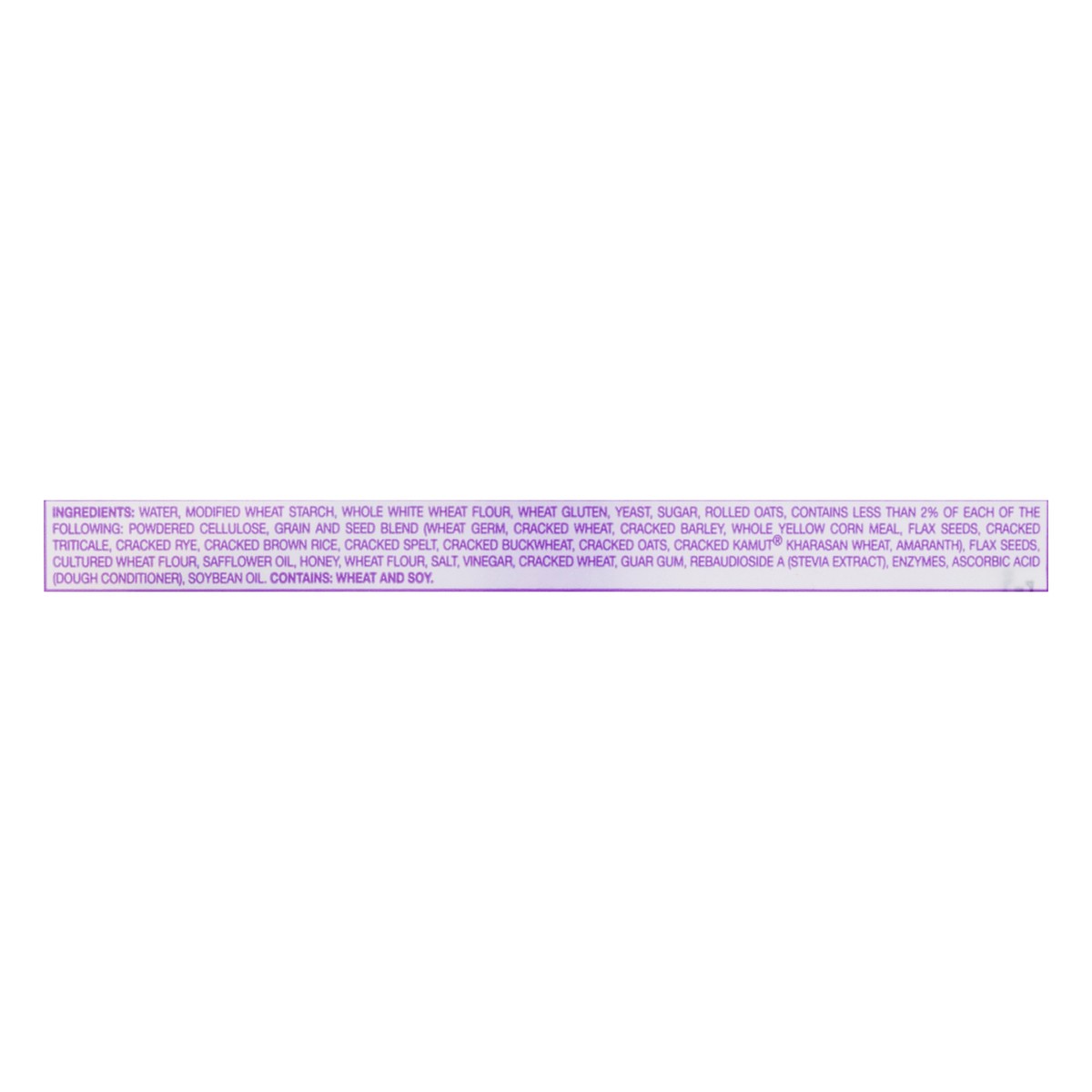 Water, Modified Wheat Starch, Whole White Wheat Flour, Wheat Gluten, Yeast, Sugar, Rolled Oats, Contains Less than 2% of Each of the Following: Powdered Cellulose, Grain and Seed Blend (Wheat Germ, Cr…