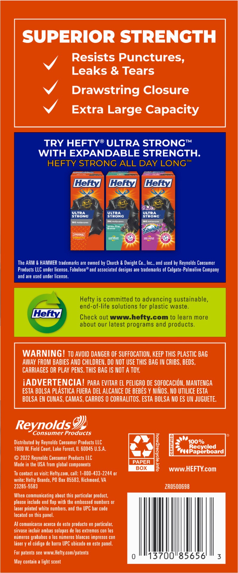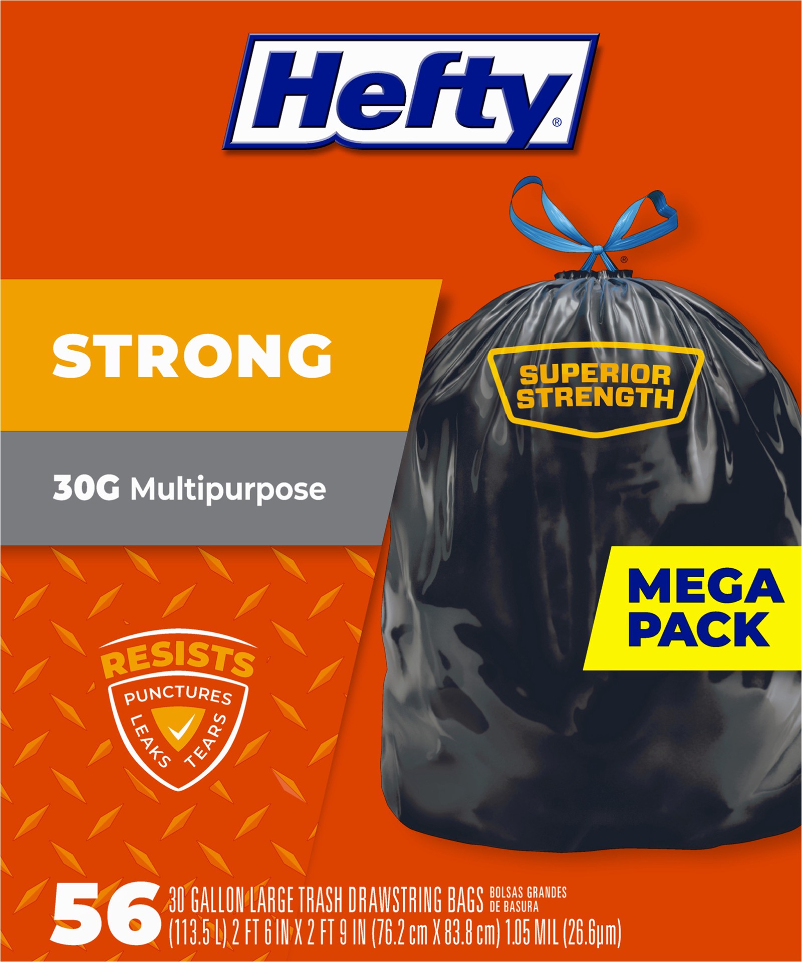Hefty Strong 30 Gallon Trash Bags help you tackle cleanup jobs all around the house, thanks to their Hefty! Hefty! Hefty! strength and large capacity. These kitchen trash bags are built strong to resiā¦