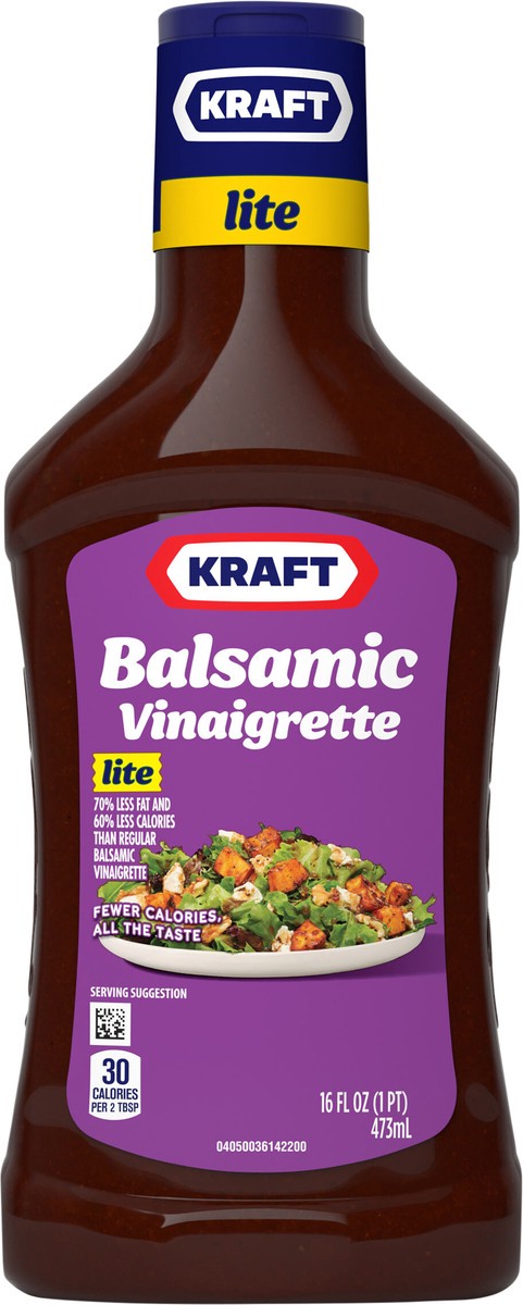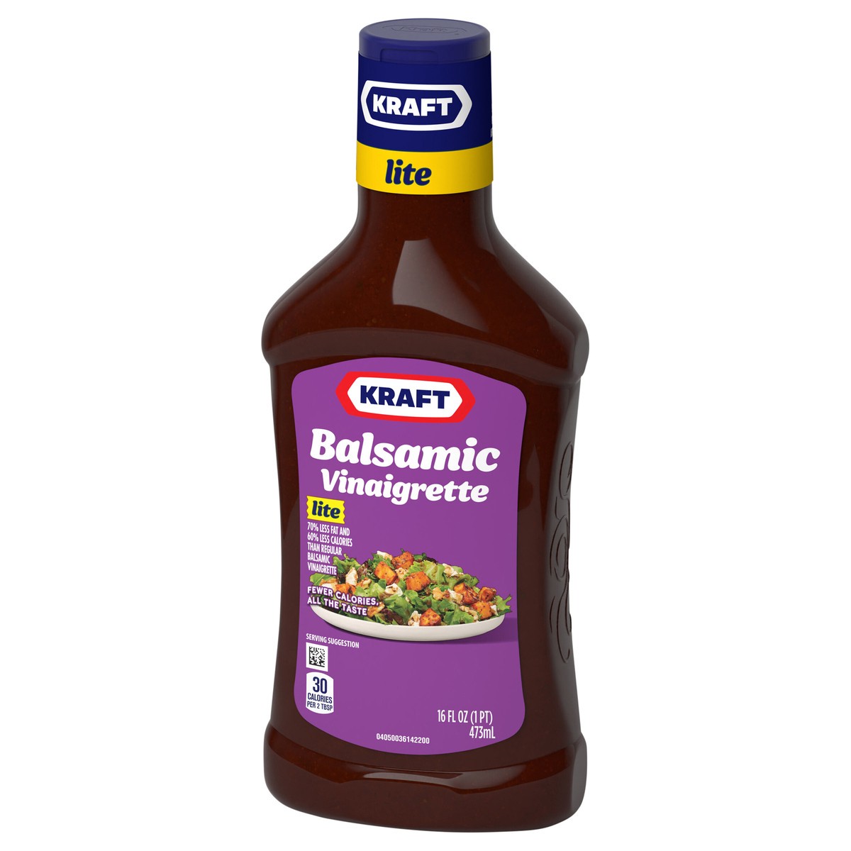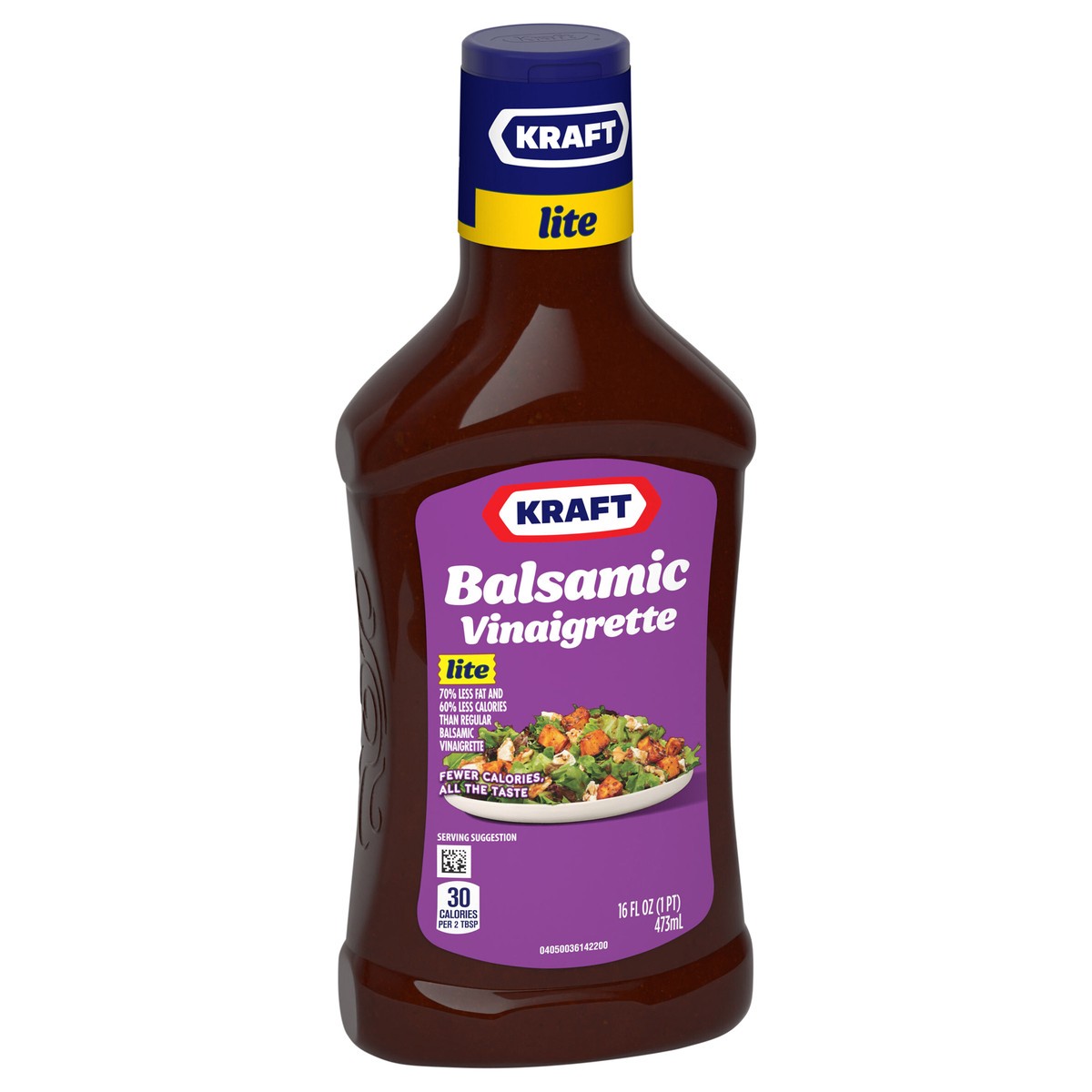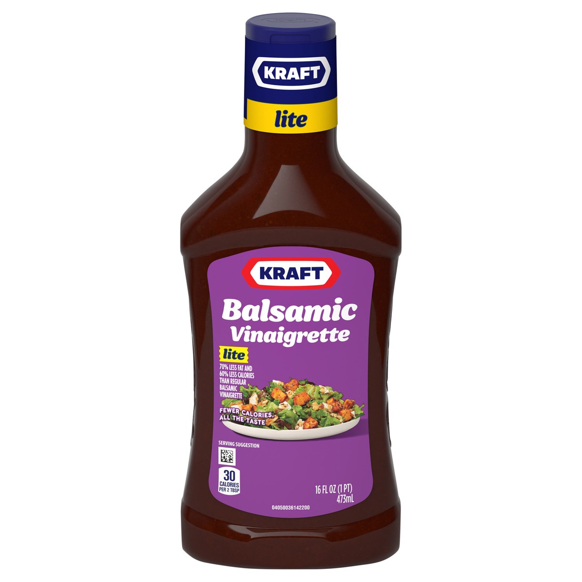 Kraft Lite Balsamic Vinaigrette brings you a crisp and refreshing vinaigrette to satisfy your cravings. Includes a hint of garlic and a satisfying kick of mustard. Toss with a salad, pour over pasta o…