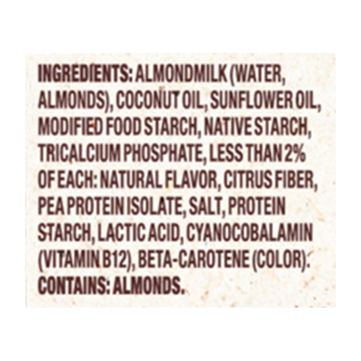 Almond Milk (Water Almonds), Coconut Oil, Sunflower Oil, Modified Starch, Native Starch, Tricalcium Phosphate, Less than 2% of Each: Natural Flavor, Citrus Fiber, Pea Protein Isolate, Salt, Protein St…