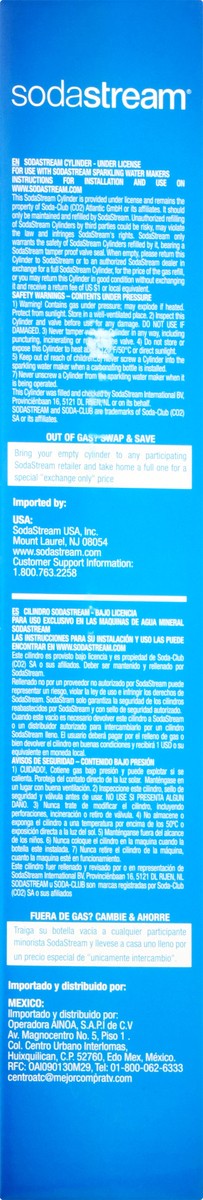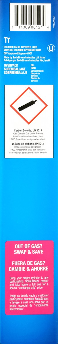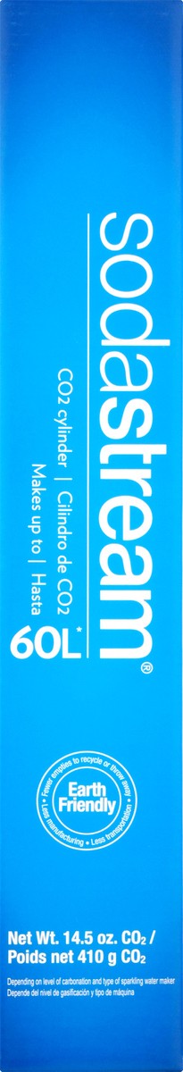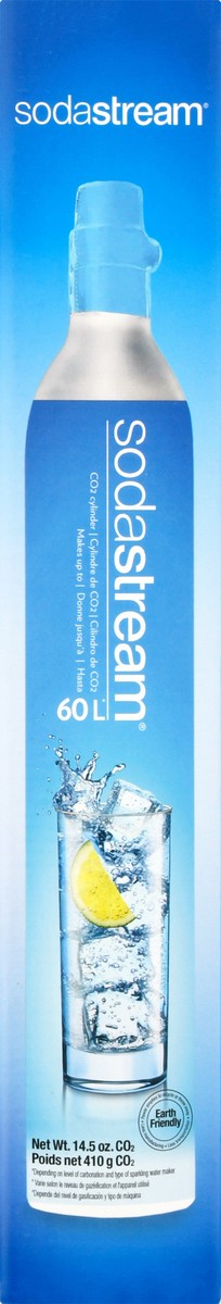 Net Wt. 14.5 oz. CO2. Overpack: CO2; E290; Carbon Dioxide. Depending on level of carbonation and type of sparkling water maker. This SodaStream cylinder is provided under license and remains the prope…
