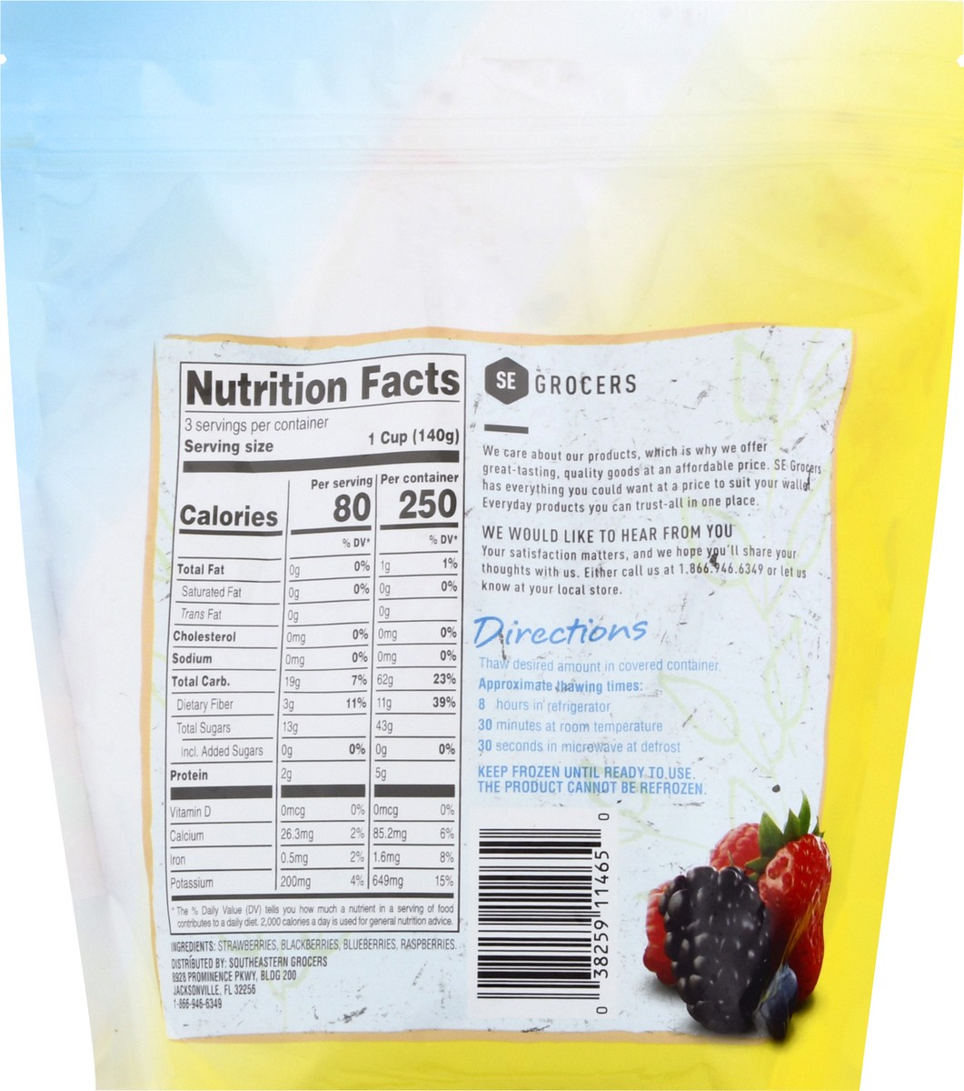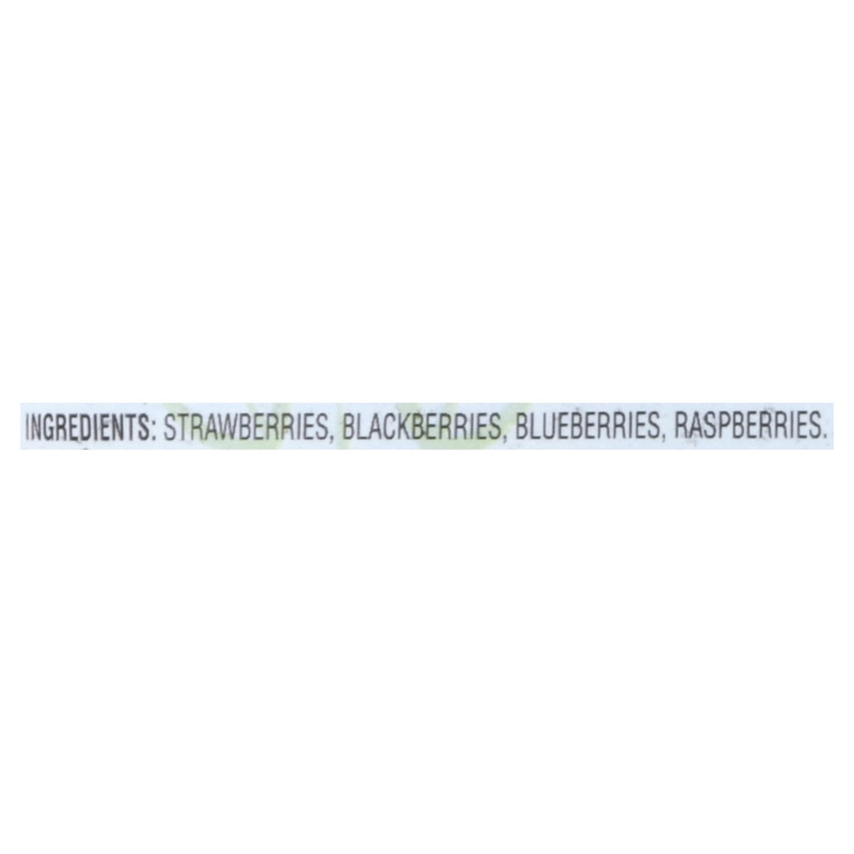 Strawberries, blackberries, blueberries, raspberries. No artificial colors & flavors. Per 1 Cup Serving: 80 calories; 0 g saturated fat (0% DV); 0 mg sodium (0% DV); 13 g total sugars. No added sugar …