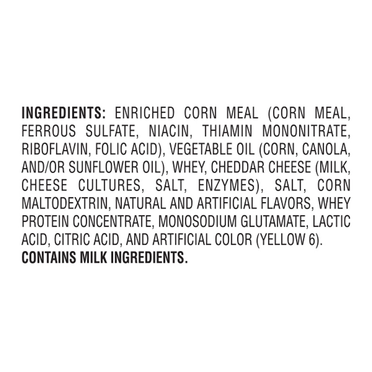 Enriched Corn Meal (Corn Meal, Ferrous Sulfate, Niacin, Thiamin Mononitrate, Riboflavin, Folic Acid), Vegetable Oil (Corn, Canola, and/or Sunflower Oil), Whey, Cheddar Cheese (Milk, Cheese Cultures, S…