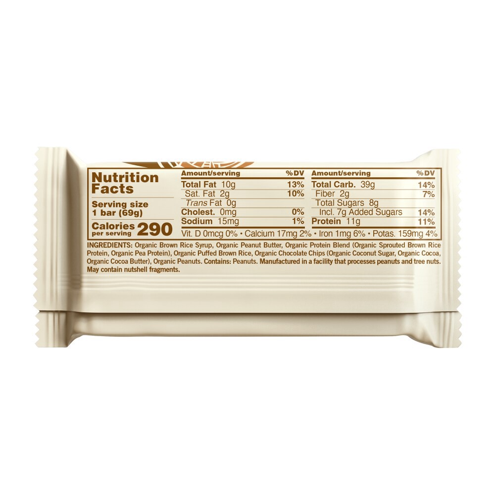 Organic Brown Rice Syrup, Organic Peanut Butter, Organic Protein Blend (Organic Sprouted Brown Rice Protein, Organic Pea Protein), Organic Chocolate Chips (Organic Coconut Sugar, Organic Cocoa, Organi…