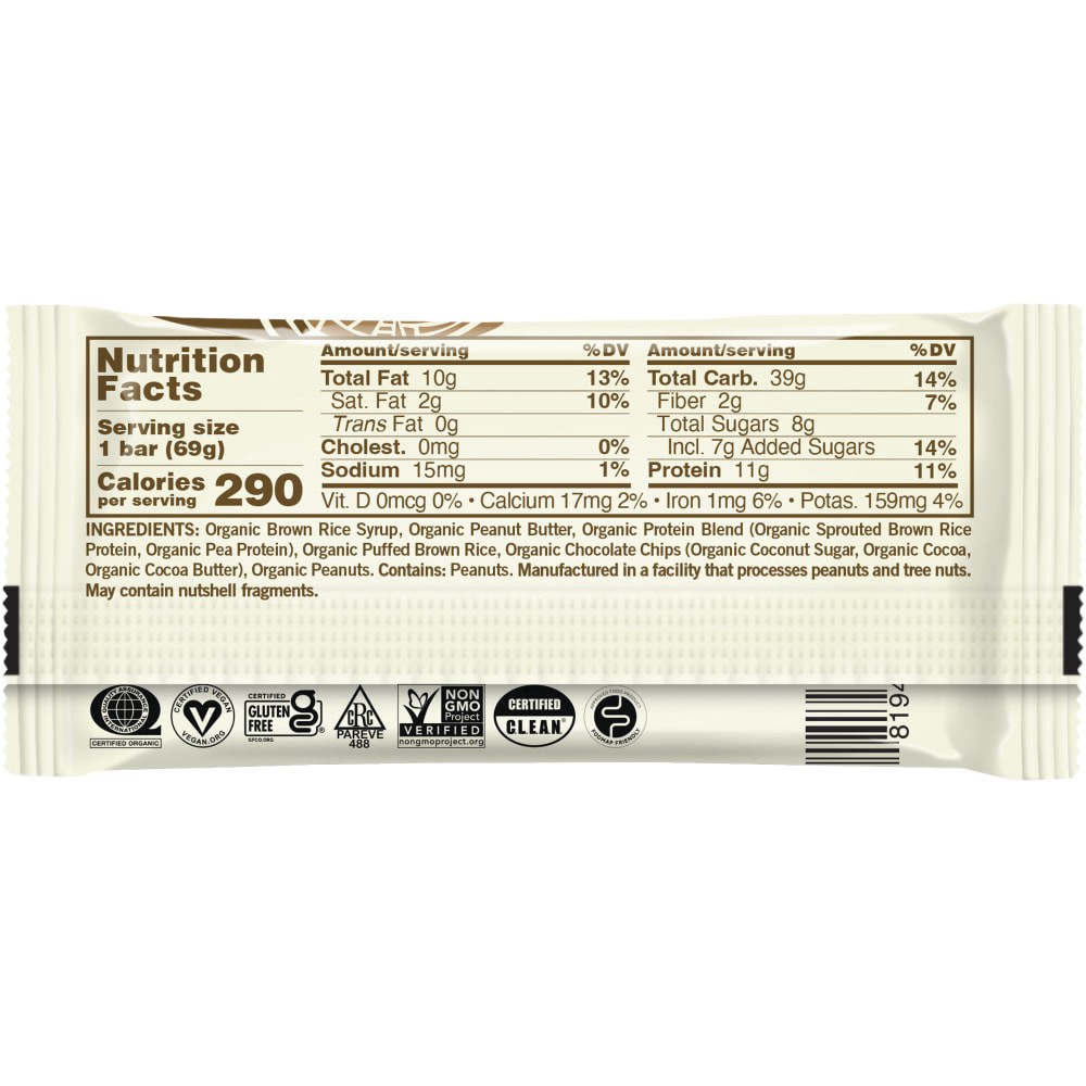 Organic Brown Rice Syrup, Organic Peanut Butter, Organic Protein Blend (Organic Sprouted Brown Rice Protein, Organic Pea Protein), Organic Chocolate Chips (Organic Coconut Sugar, Organic Cocoa, Organi…