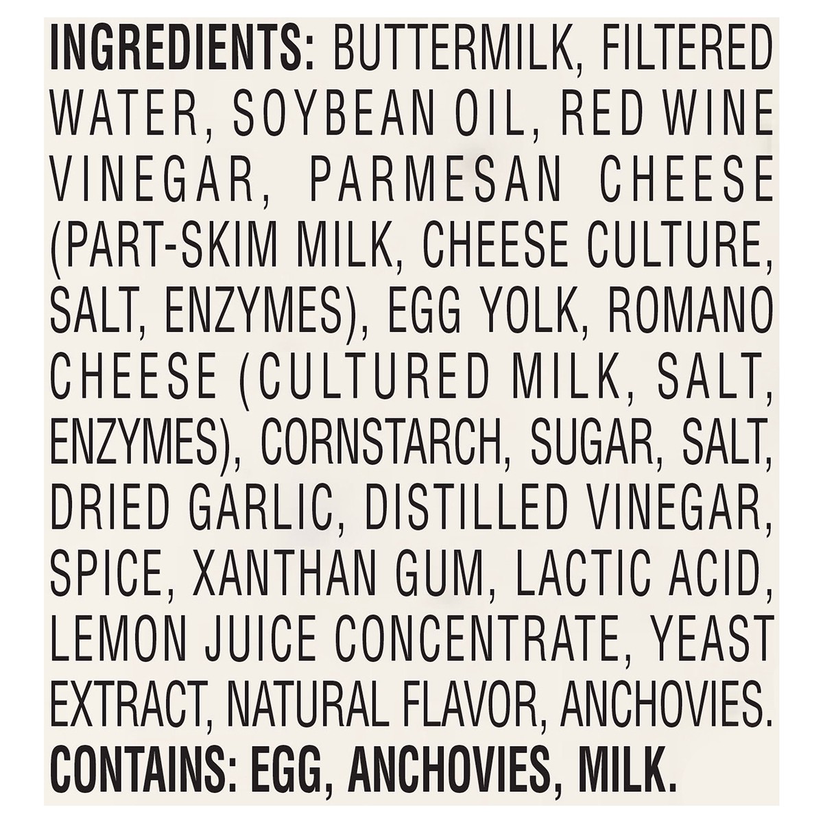 Buttermilk, Filtered Water, Soybean Oil, Red Wine Vinegar, Parmesan Cheese (Part-Skim Milk, Cheese Culture, Salt, Enzymes), Egg Yolk, Romano Cheese (Cultured Milk, Salt, Enzymes), Cornstarch, Sugar, S…