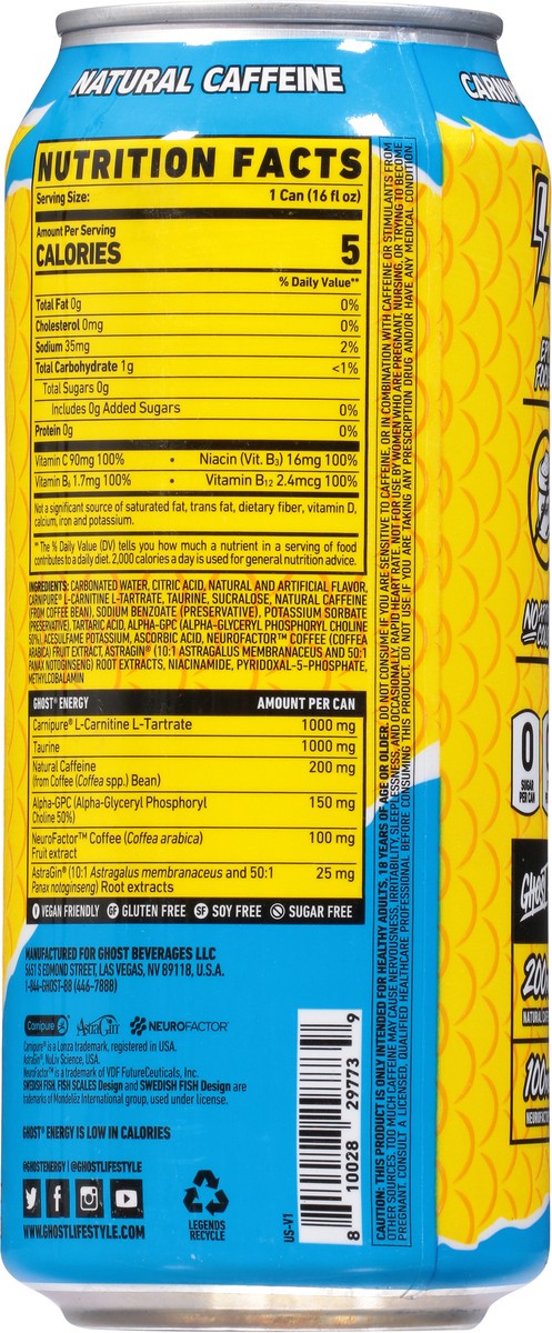 - TOTAL TRANSPARENCY: All Ghost products feature a transparent label that fully discloses the dose of each active ingredient. Zero proprietary blends means you know what you’re getting in each and every sip. Ghost Energy contains zero-sugars and is vegan-friendly and gluten-free.