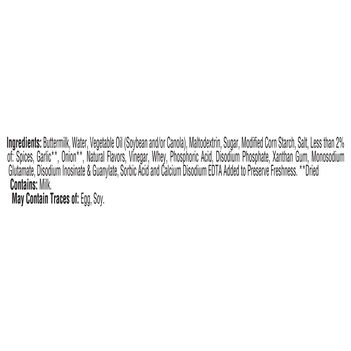 Buttermilk, Water, Vegetable Oil (Soybean and/or Canola), Maltodextrin, Sugar, Modified Corn Starch, Salt, Less than 2% of: Spices, Garlic**, Onion**, Natural Flavors, Vinegar, Whey, Phosphoric Acid, …