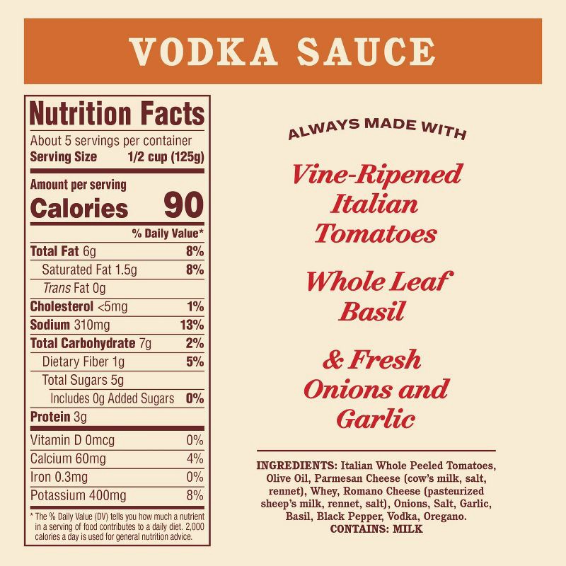 Italian Whole Peeled Tomatoes, Olive Oil, Parmesan Cheese (Cow's Milk, Salt, Rennet), Whey, Romano Cheese (Pasteurized Sheep's Milk, Rennet, Salt), Onions, Salt, Garlic, Basil, Black Pepper, Vodka, Or…