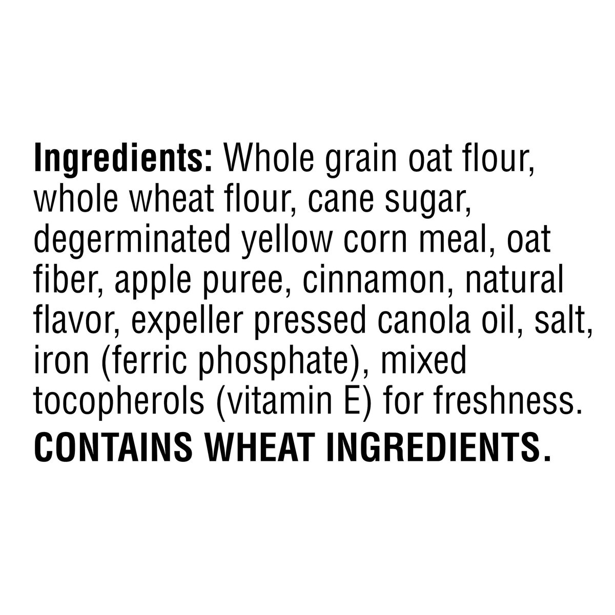 Whole Grain Oat Flour, Whole Wheat Flour, Cane Sugar, Degerminated Yellow Corn Meal, Oat Fiber, Apple Puree, Cinnamon, Natural Flavor, Expeller Pressed Canola Oil, Salt, Iron (Ferric Phosphate), Mixed…