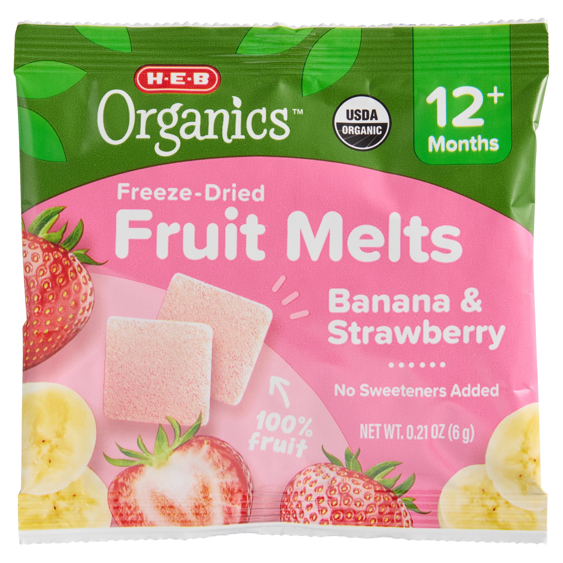 Give your toddler these H-E-B freeze-dried fruit melts for a snack made with 100% fruit. Available in a banana and strawberry flavor, they contain no added sugar for a sweet treat with none of the ext…
