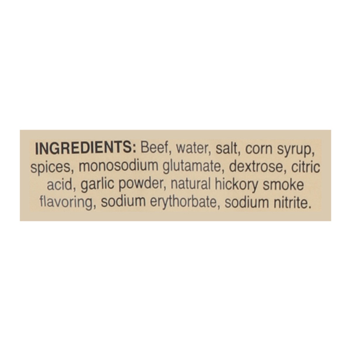 Beef, Water, Salt, Corn Syrup, Spices, Monosodium Glutamate, Dextrose, Citric Acid, Garlic Powder, Natural Hickory Smoke Flavoring, Sodium Erythorbate, Sodium Nitrite.