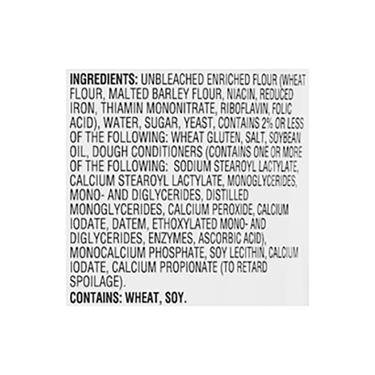 Unbleached Enriched Flour (Wheat Flour, Malted Barley Flour, Niacin, Reduced Iron, Thiamin Mononitrate, Riboflavin, Folic Acid), Water, Sugar, Yeast, Contains 2% or Less of the Following: Wheat Gluten…