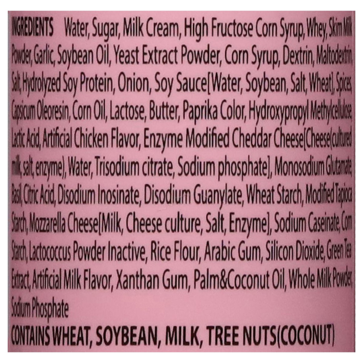 Water, Sugar, Milk Cream, High Fructose Corn Syrup, Whey, Skim Milk Powder, Garlic, Soybean Oil, Yeast Extract Powder, Corn Syrup, Dextrin, Maltodextrin, Salt, Hydrolyzed Soy Protein, Onion, Soy Sauce…