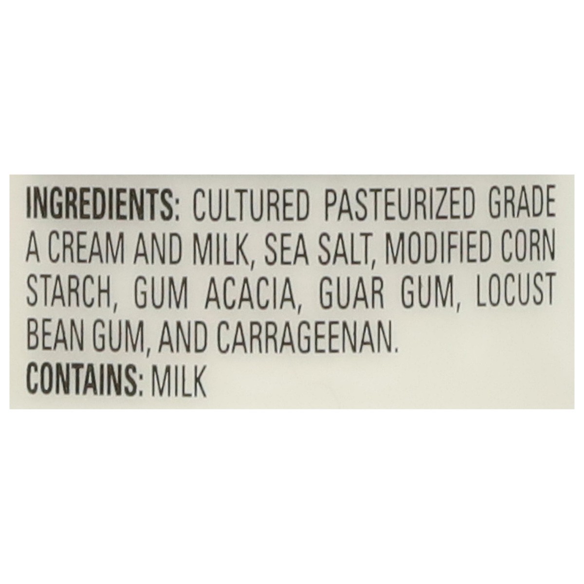 Cultured Pasteurized Grade A Cream and Milk, Sea Salt, Modified Corn Starch, Gum Acacia, Guar Gum, Locust Bean Gum, and Carrageenan.
