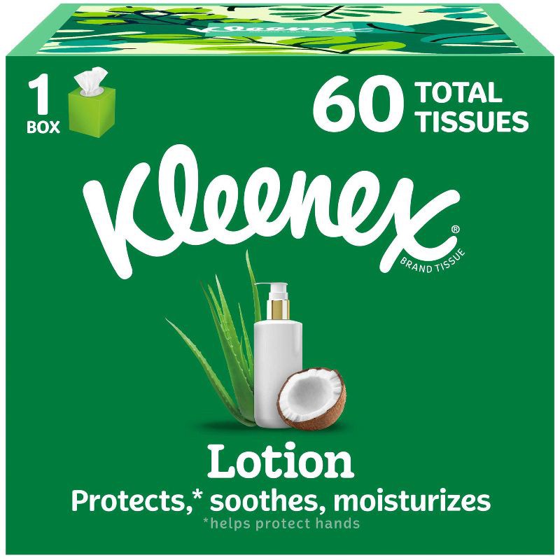 - Each box of Kleenex Soothing Lotion Facial Tissues with Coconut Oil, Aloe & Vitamin E and contains 60 tissues—packaging may vary from what is shown.