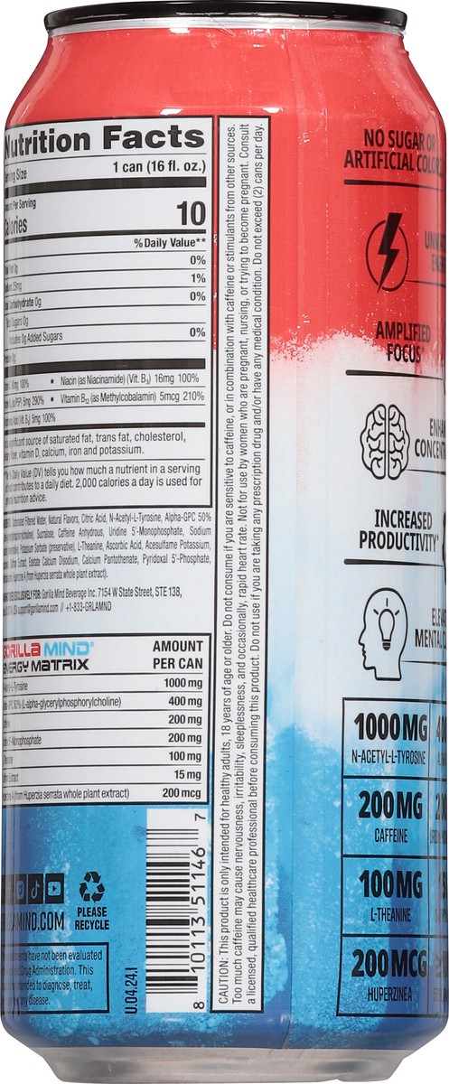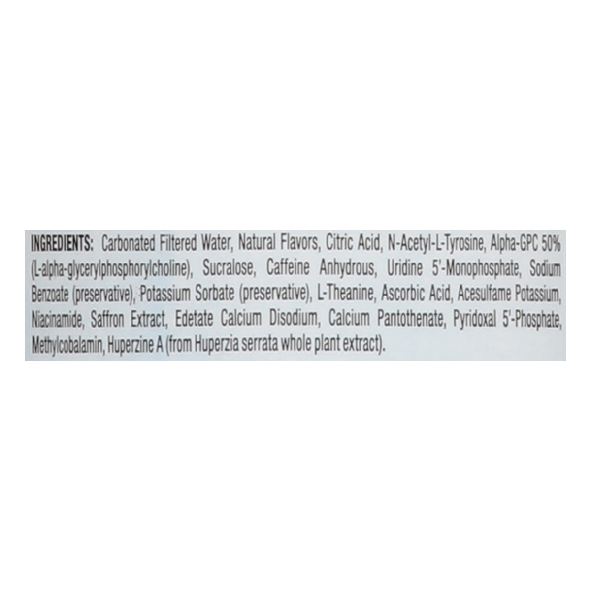 Carbonated Filtered Water, Natural Flavors, Citric Acid, N-Acetyl-L-Tyrosine, Alpha-GPC 50% (L-Alpha-Glycerylphosphorylcholine), Sucralose, Caffeine Anhydrous, Uridine 5'-Monophosphate, Sodium Benzoat…