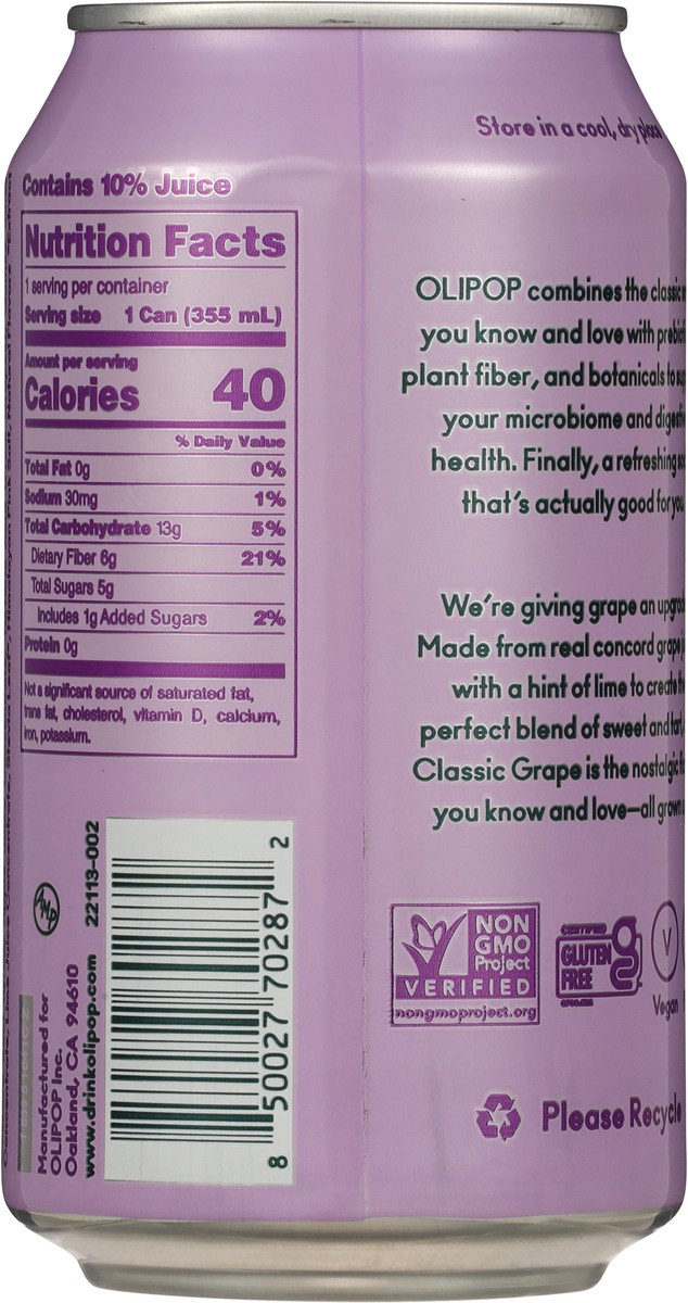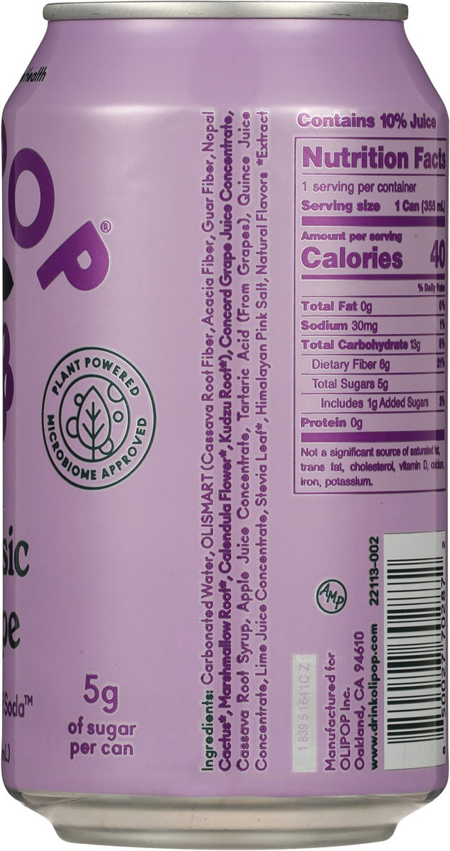 Carbonated Water, Olismart (Cassava Root Fiber, Acacia Fiber, Guar Fiber, Nopal Cactus*, Marshmallow Root*, Calendula Flower*, Kudzu Root*), Concord Grape Juice Concentrate, Cassava Root Syrup, Apple …