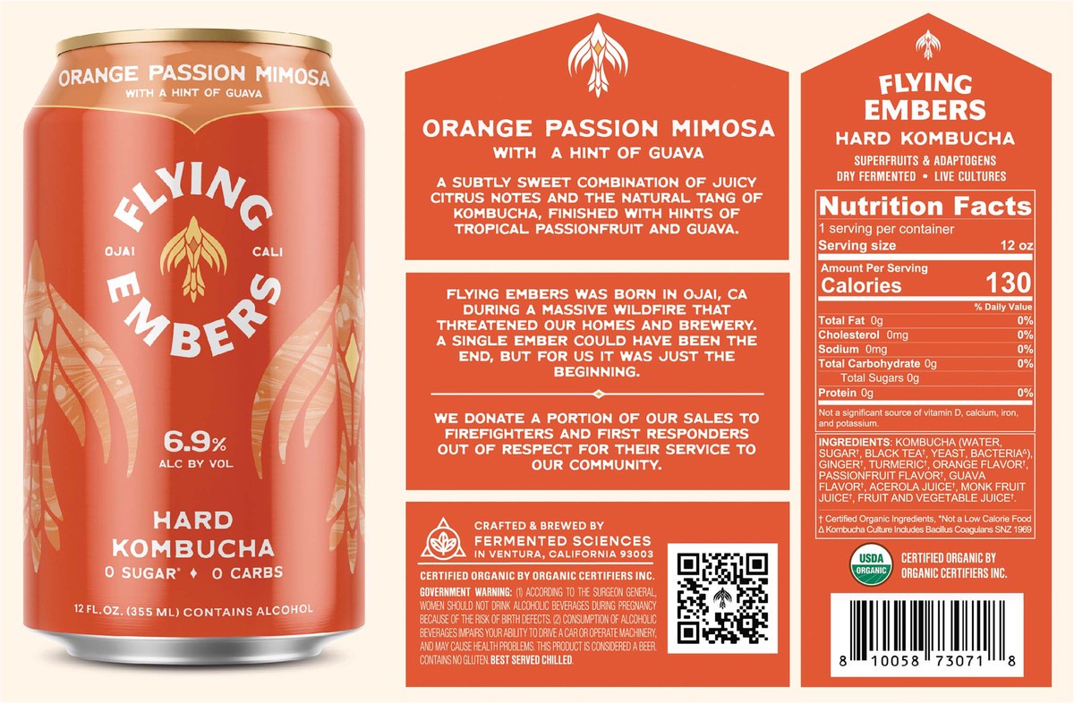 Please drink responsibly. A subtly sweet combination of juicy citrus notes and the natural tang of kombucha, finished with hints of tropical passionfruit and guava. Flying Embers was born in Ojai, CA …
