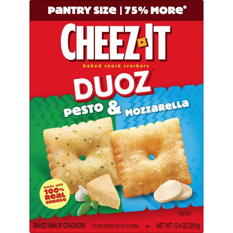 - Discover two different flavors - zesty pesto and smooth mozzarella - in one Cheez-It Duoz box; Want It, Need It, Cheez-It
