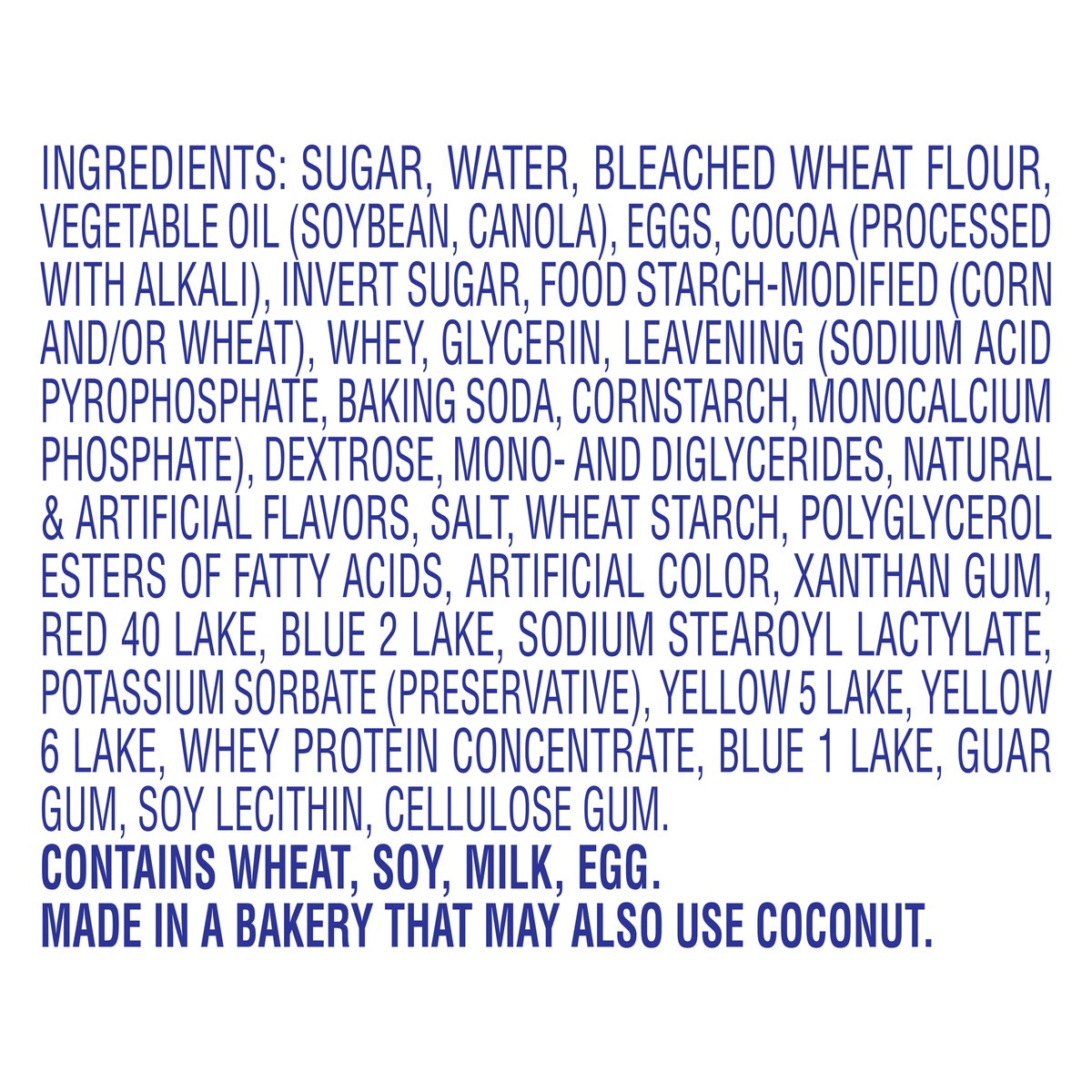 Sugar, Water, Bleached Wheat Flour, Vegetable Oil [Soybean, Canola], Eggs, Cocoa (Processed With Alkali), Invert Sugar, Food Starch-Modified (Corn And/Or Wheat), Whey, Glycerin, Leavening [Sodium Acid…