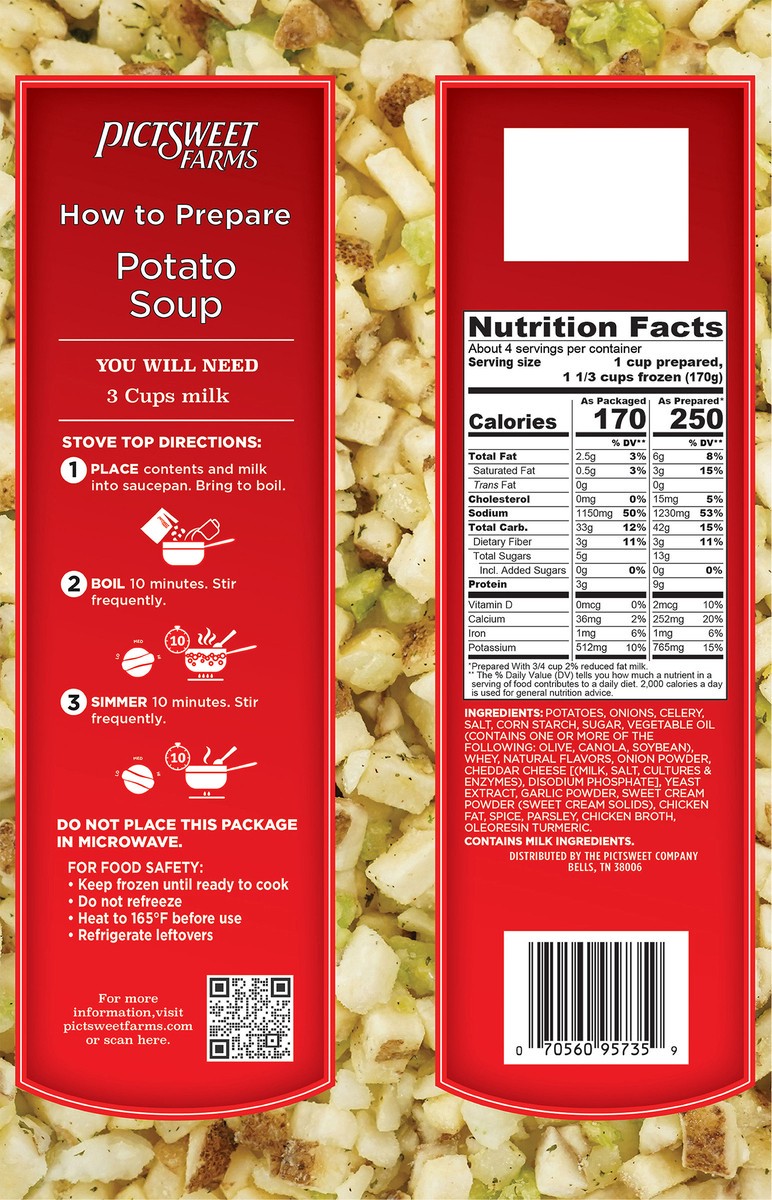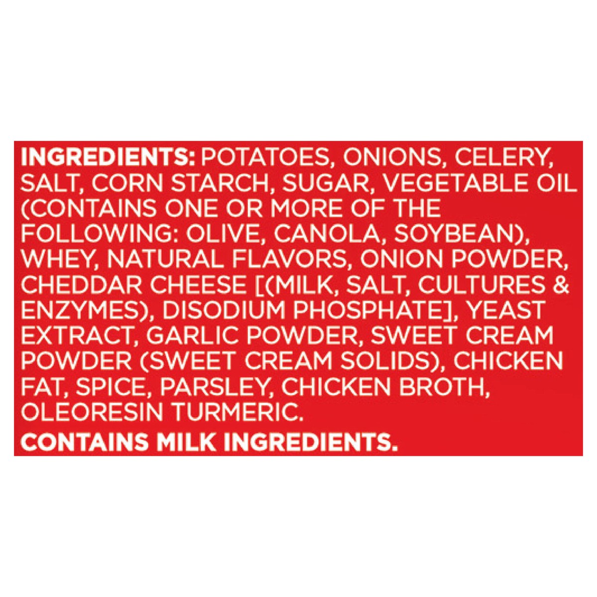Potatoes, Onions, Celery, Salt, Corn Starch, Sugar, Vegetable Oil (Contains One or More of the Following: Olive, Canola, Soybean), Whey, Natural Flavors, Onion Powder, Cheddar Cheese [(Milk, Salt, Cul…
