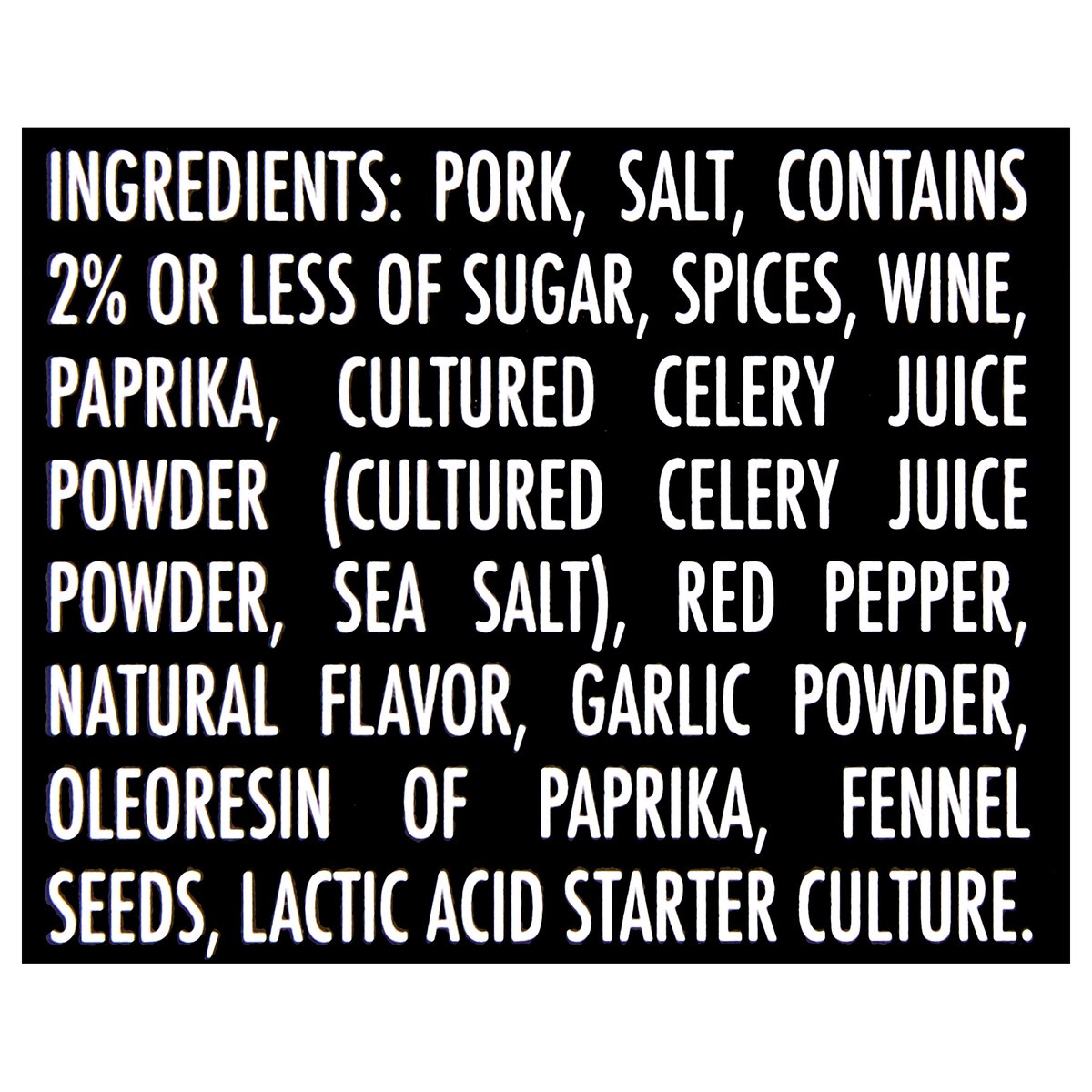 Pork, Salt, Contains 2% or Less of Sugar, Spices, Wine, Paprika, Cultured Celery Juice Powder (Cultured Celery Juice Powder, Sea Salt), Red Pepper, Natural Flavor, Garlic Powder, Oleoresin of Paprika,…