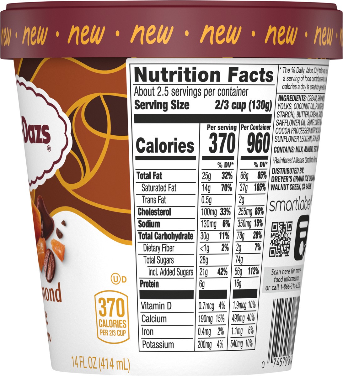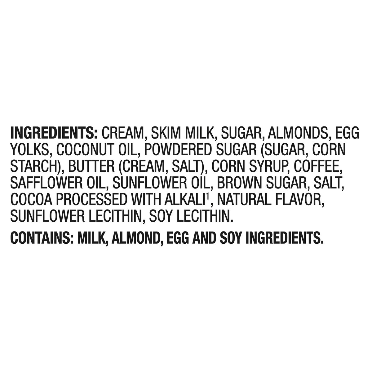 Cream, Skim Milk, Sugar, Almonds, Egg Yolks, Coconut Oil, Powdered Sugar (Sugar, Corn Starch), Butter (Cream, Salt), Corn Syrup, Coffee, Safflower Oil, Sunflower Oil, Brown Sugar, Salt, Cocoa Processe…