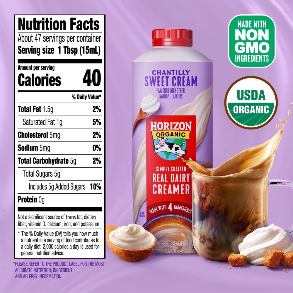 - DELICIOUSLY CREAMY: One 24 fl oz carton of Horizon Organic Real Dairy Chantilly Sweet Cream Coffee Creamer made with organic milk and cream adds rich flavor to your favorite coffee beverages