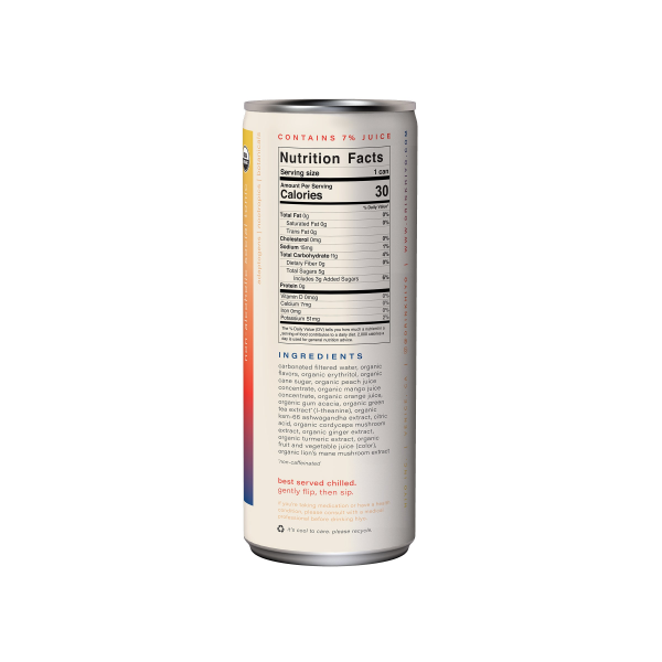 Carbonated Filtered Water, Organic Erythritol, Organic Flavors, Organic Cane Sugar, Organic Peach Juice Concentrate, Organic Mango Juice Concentrate, Organic Lemon Balm Extract, Organic Gum Acacia, Or…