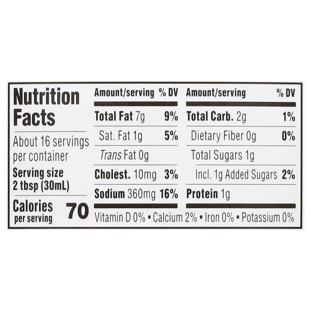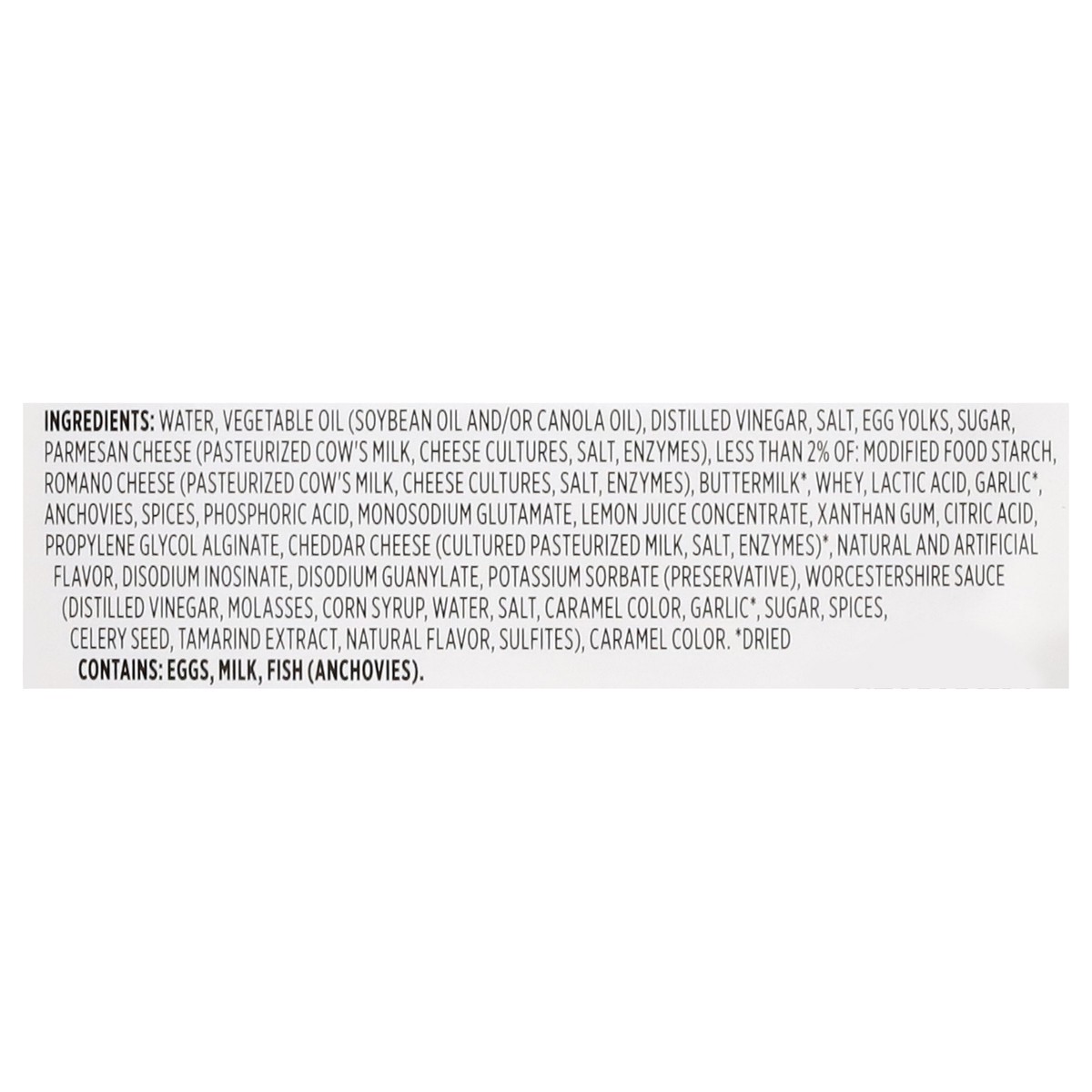 Water, Vegetable Oil (Soybean Oil and/or Canola Oil), Distilled Vinegar, Salt, Egg Yolks, Sugar, Parmesan Cheese (Pasteurized Cow’s Milk, Cheese Cultures, Salt, Enzymes), Less than 2% of: Modified Foo…