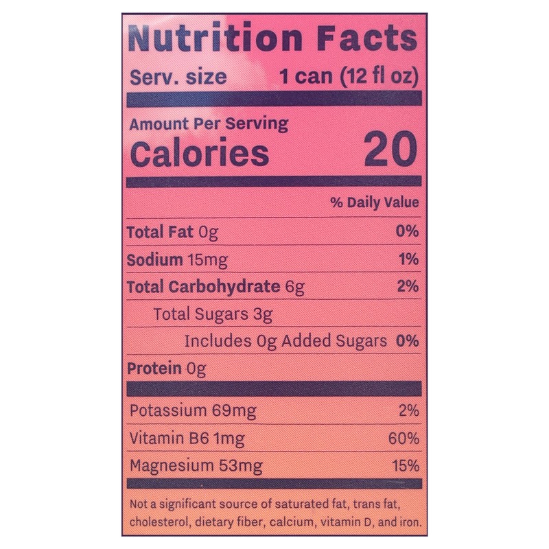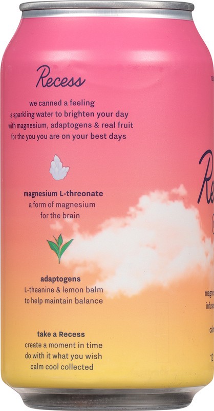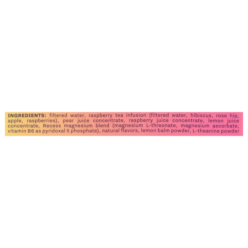 Filtered Water, Raspberry Tea Infusion (Filtered Water, Hibiscus, Rose Hip, Apple, Raspberries), Pear Juice Concentrate, Raspberry Juice Concentrate, Lemon Juice Concentrate, Recess Magnesium Blend (M…