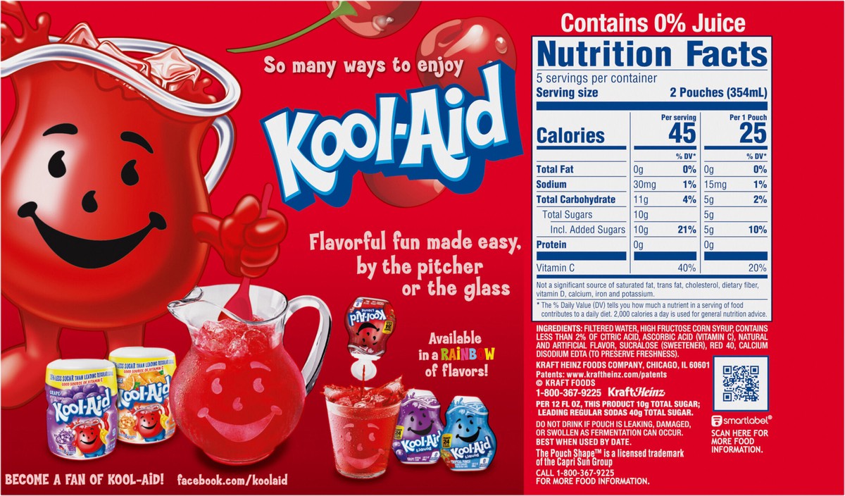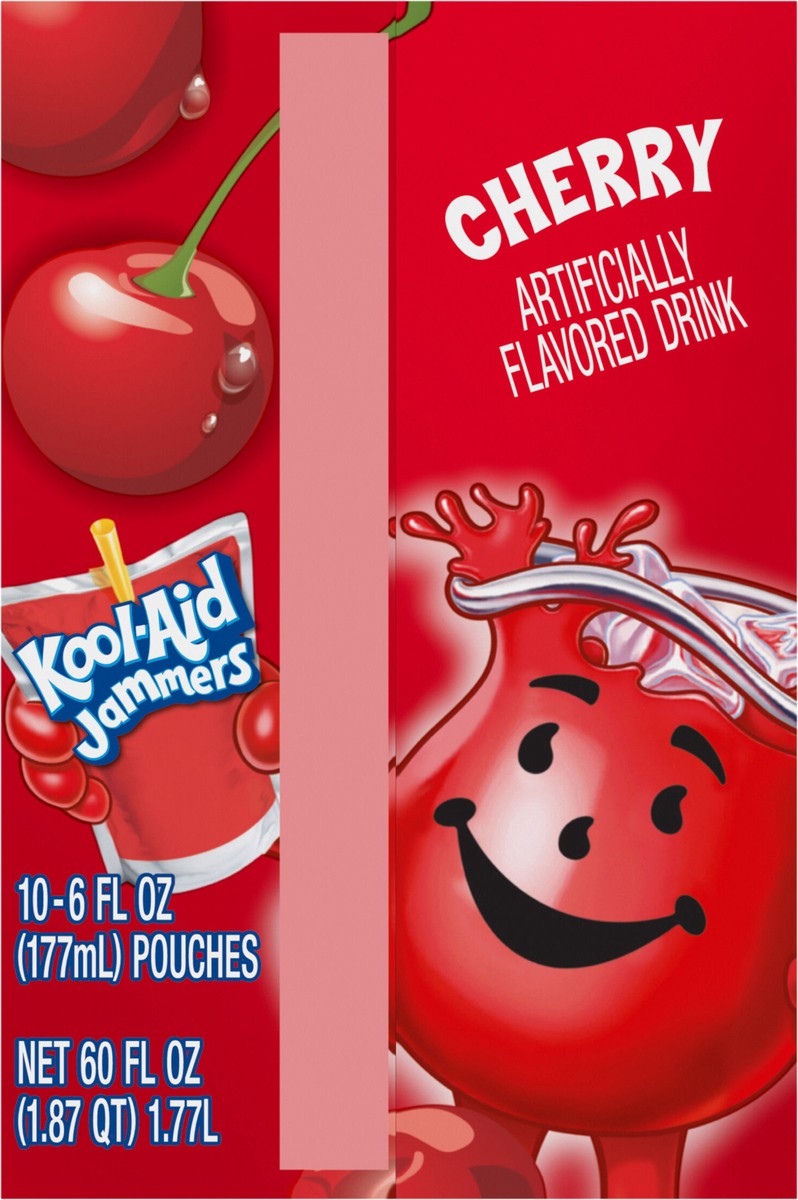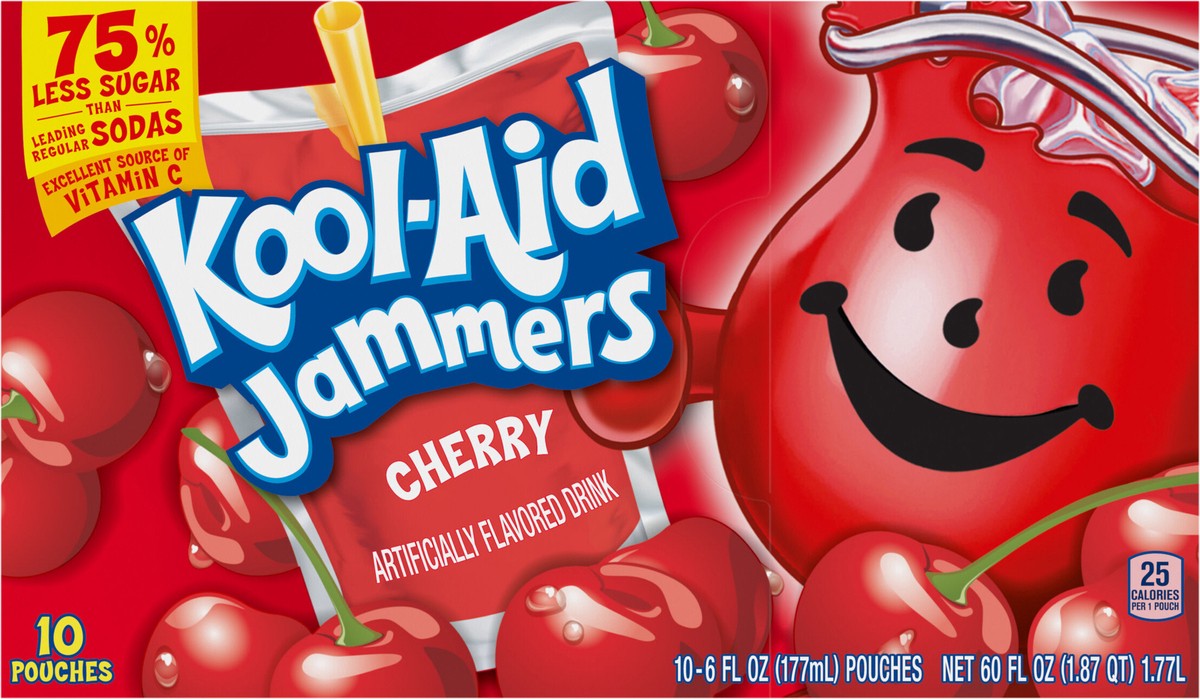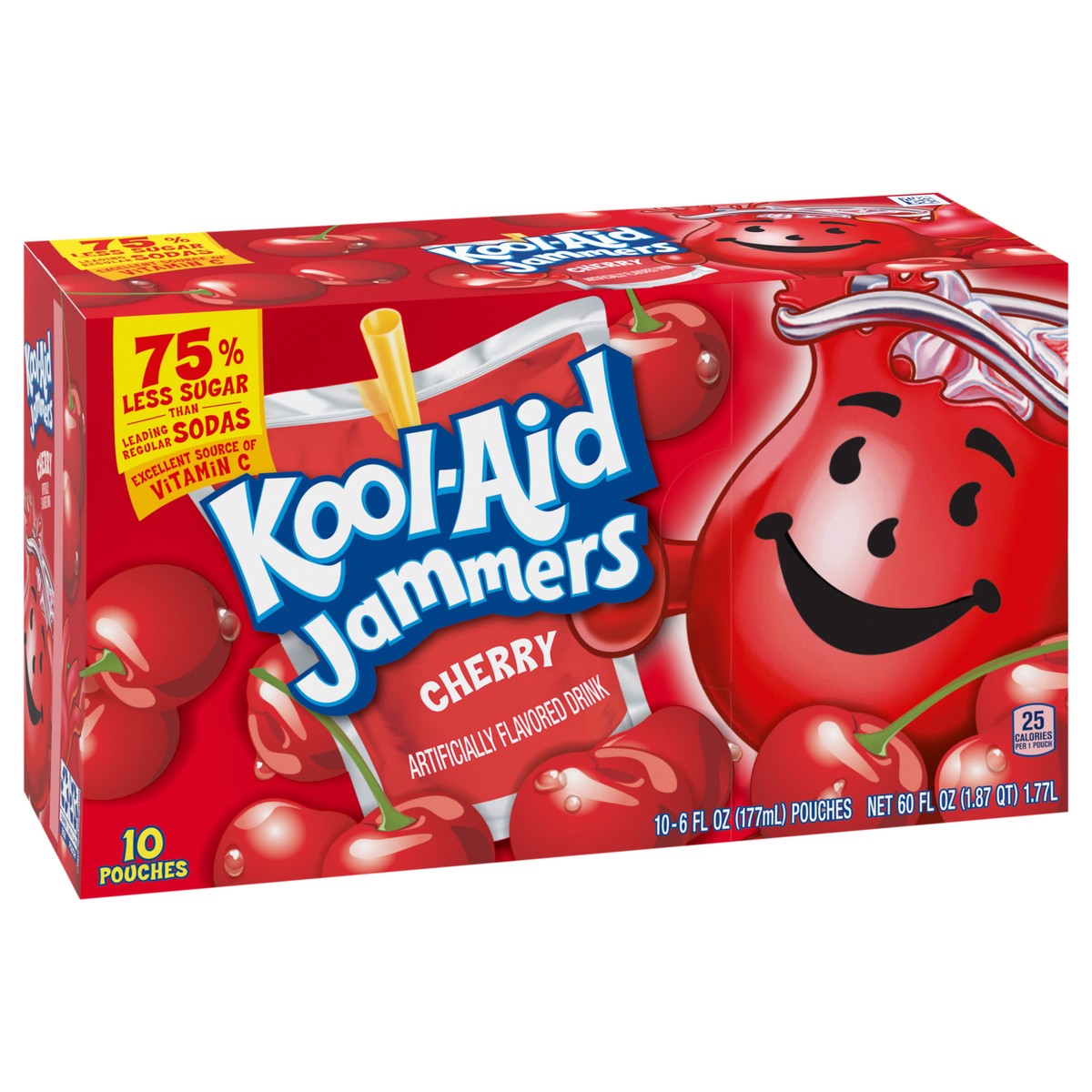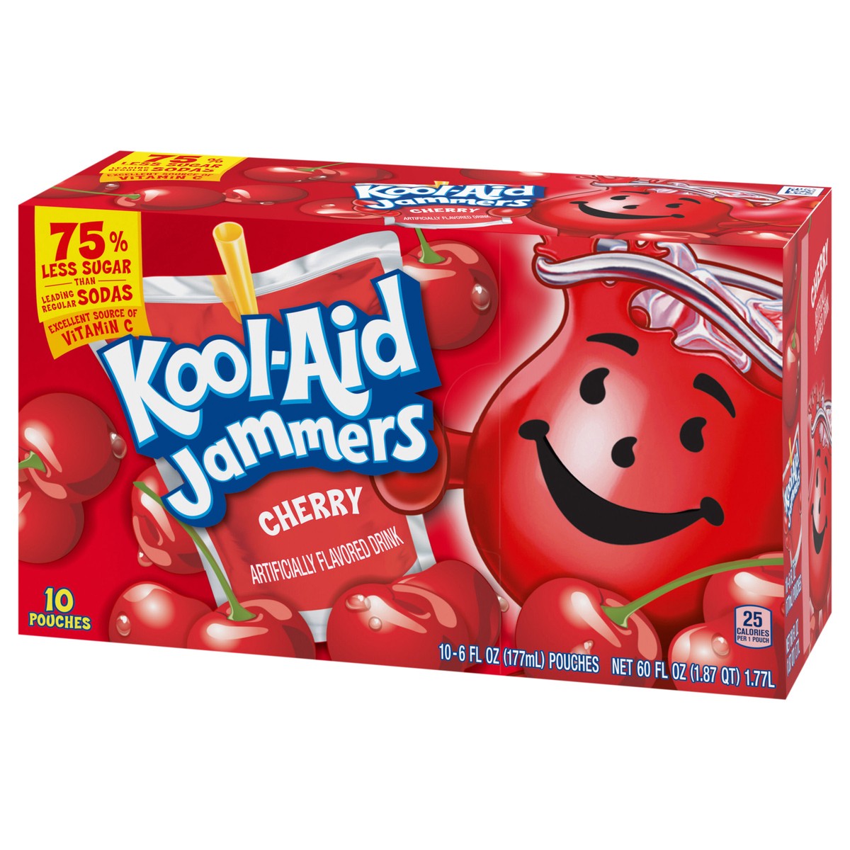 Kool-Aid Jammers Artificially Flavored Cherry Drink Pouches deliver fun with a sweet blend of cherry flavor. Our delicious kids drink contains 75% less sugar than leading regular sodas (per 12 fl oz, …