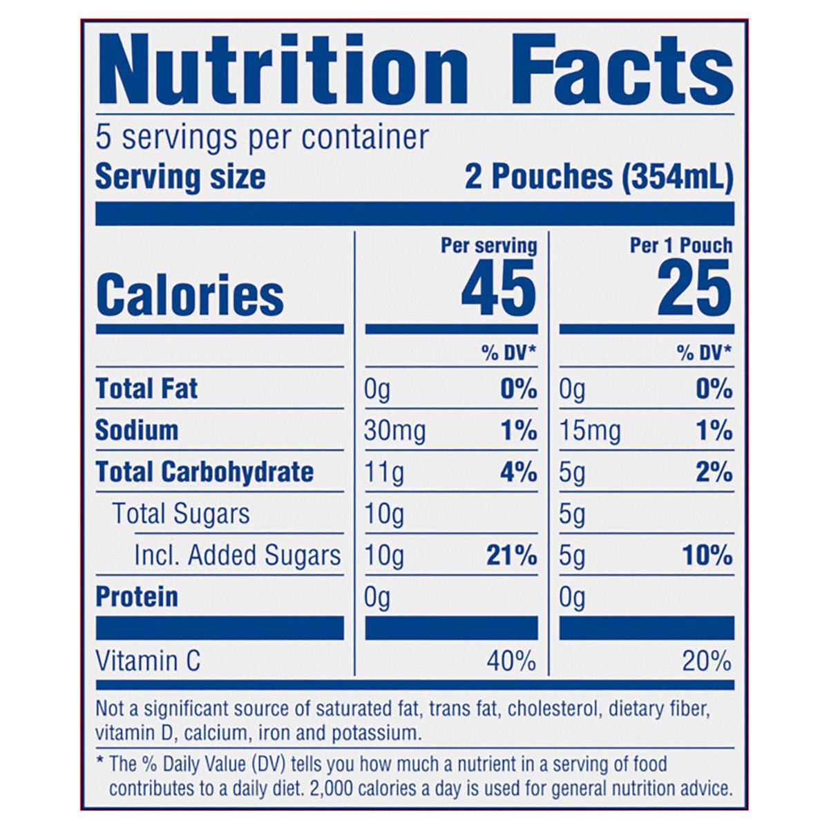 FILTERED WATER, HIGH FRUCTOSE CORN SYRUP, CONTAINS LESS THAN 2% OF CITRIC ACID, ASCORBIC ACID (VITAMIN C), NATURAL AND ARTIFICIAL FLAVOR, SUCRALOSE (SWEETENER), RED 40, CALCIUM DISODIUM EDTA (TO PRESE…