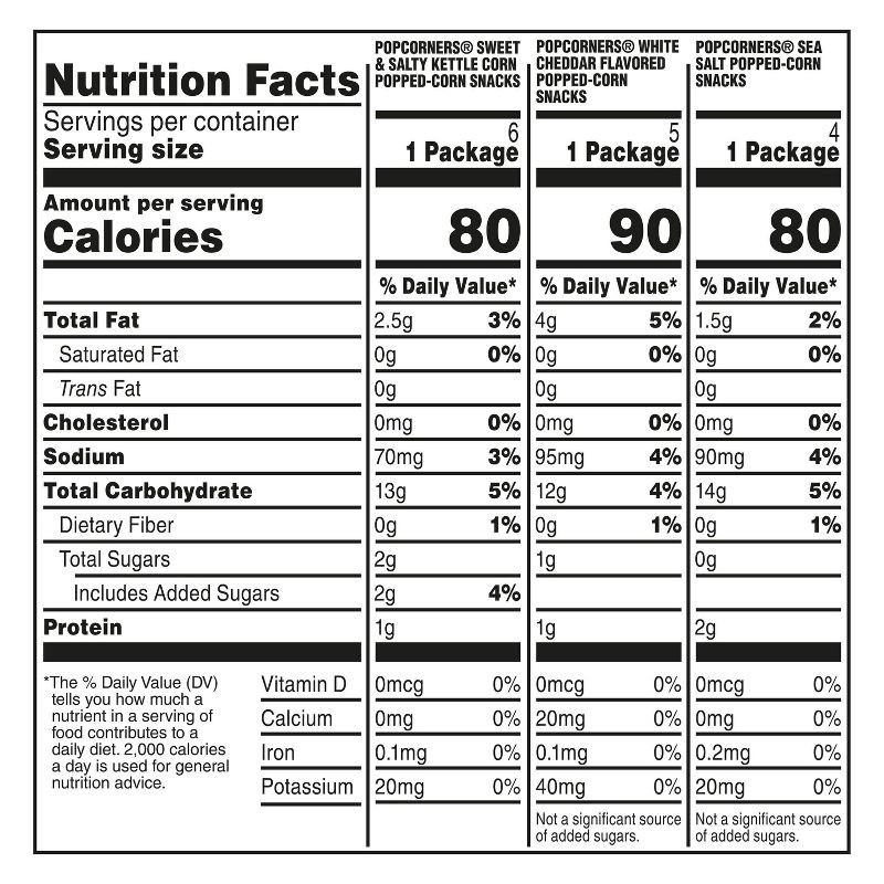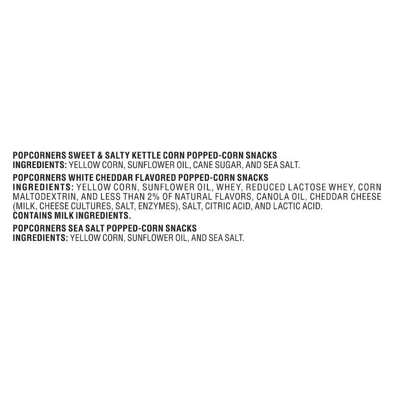 Popcorners Sweet & Salty Kettle Corn Popped-Corn Snacks Ingredients: Yellow Corn, Sunflower Oil, Cane Sugar, And Sea Salt. Popcorners White Cheddar Flavored Popped-Corn Snacks Ingredients: Yellow Corn…