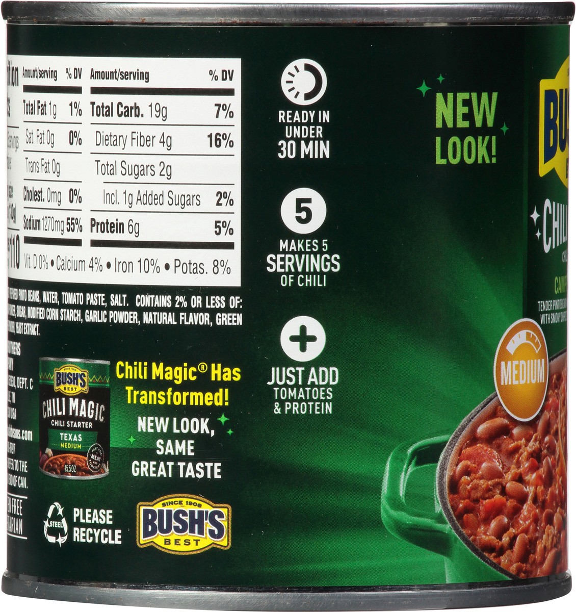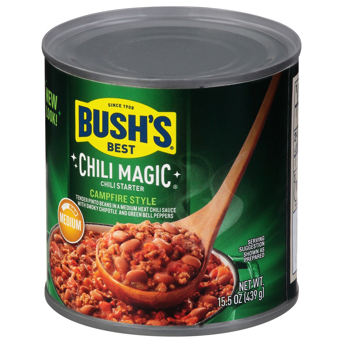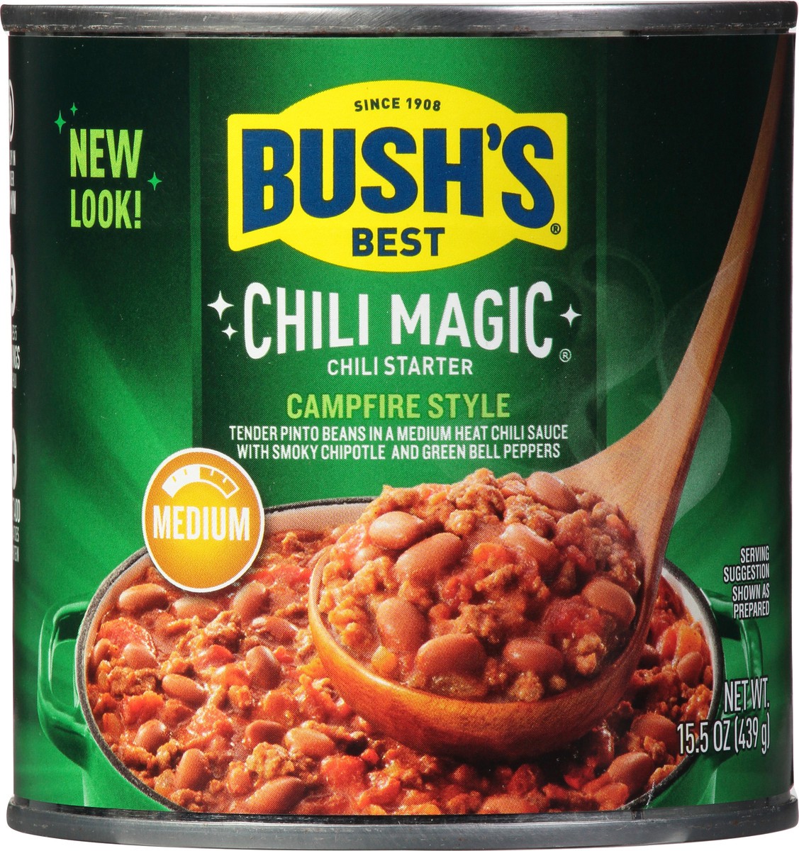 Where there''s chipotle smoke, there''s chili fire. Bush''s Chili Magic Campfire Style chili starter brings tender pinto beans together with smoky chipotle and green bell peppers for quick, unforgetta…