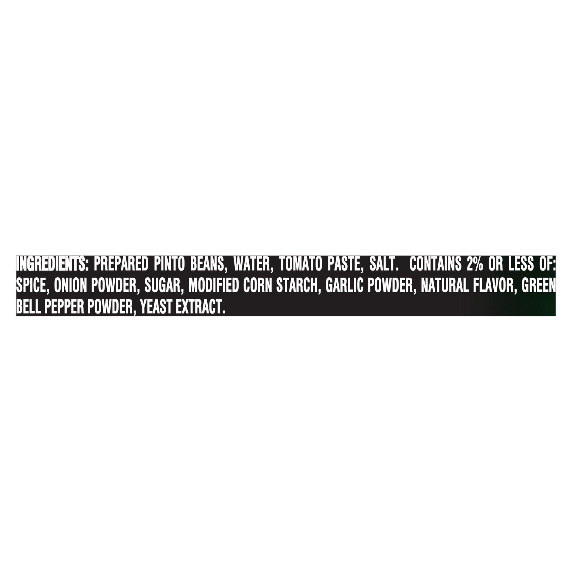 Prepared Pinto Beans, Water, Tomato Paste, Salt, Contains less than 2% of: Spice, Onion Powder, Sugar, Modified Corn Starch, Garlic Powder, Natural Flavor, Green Bell Pepper Powder, Yeast Extract.