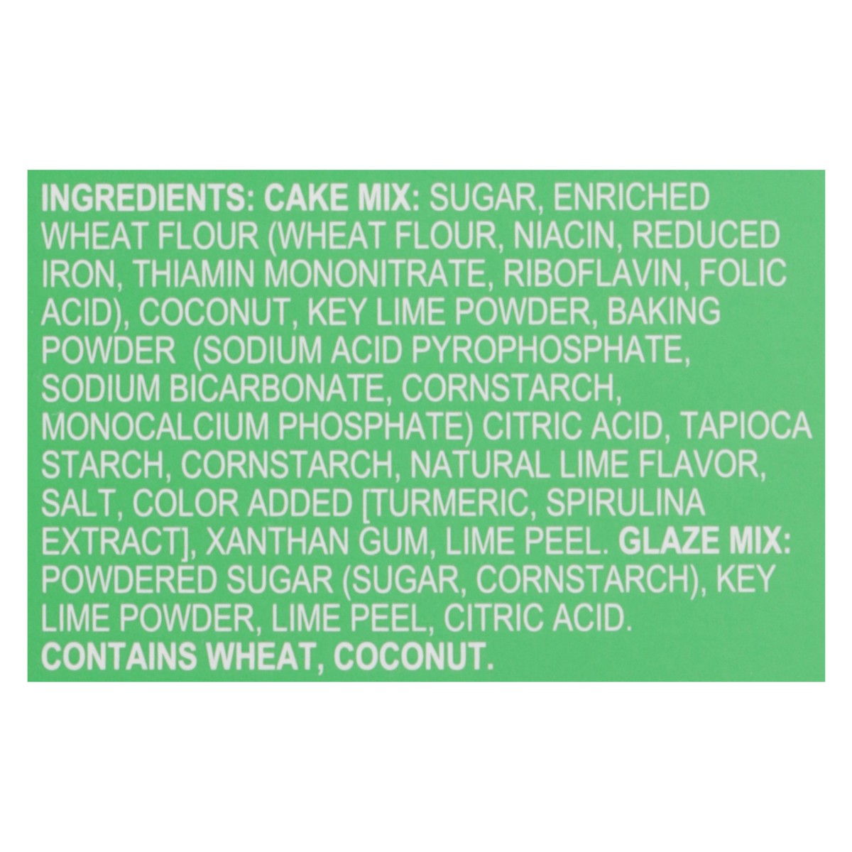 Cake Mix: Sugar, Enriched Wheat Flour (Wheat Flour, Niacin, Reduced Iron, Thiamin Mononitrate, Riboflavin, Folic Acid), Coconut, Key Lime Powder, Baking Powder (Sodium Acid Pyrophosphate, Sodium Bicar…