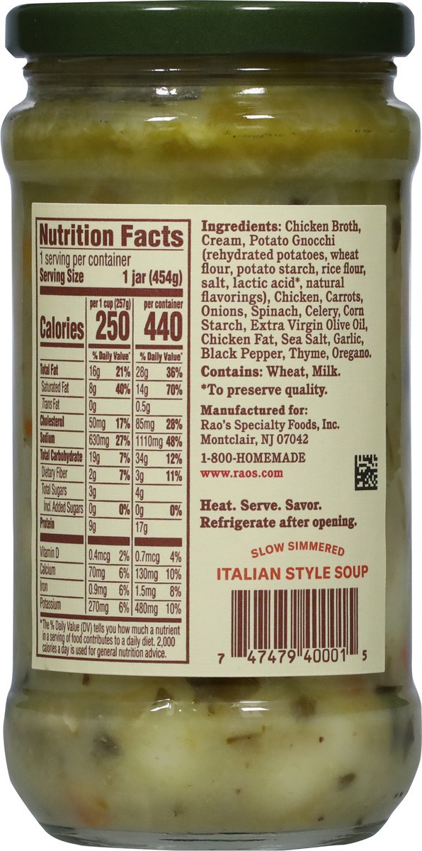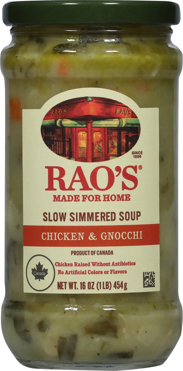 - Bring home the famous taste of Rao's with this 16 ounce jar of Rao's Made for Home Chicken Gnocchi Soup