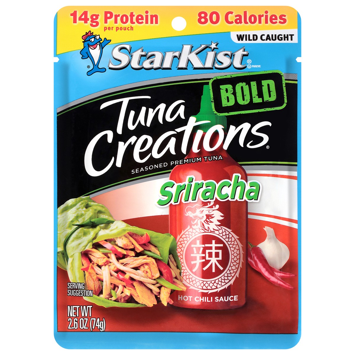Wild caught. Tear. Eat. Go. Flavor fresh pouch. Sriracha: Hey, can someone pass the sriracha down here? We seasoned our premium wild caught tune with a perfectly spicy-sweet hot sauce, with hints of g…