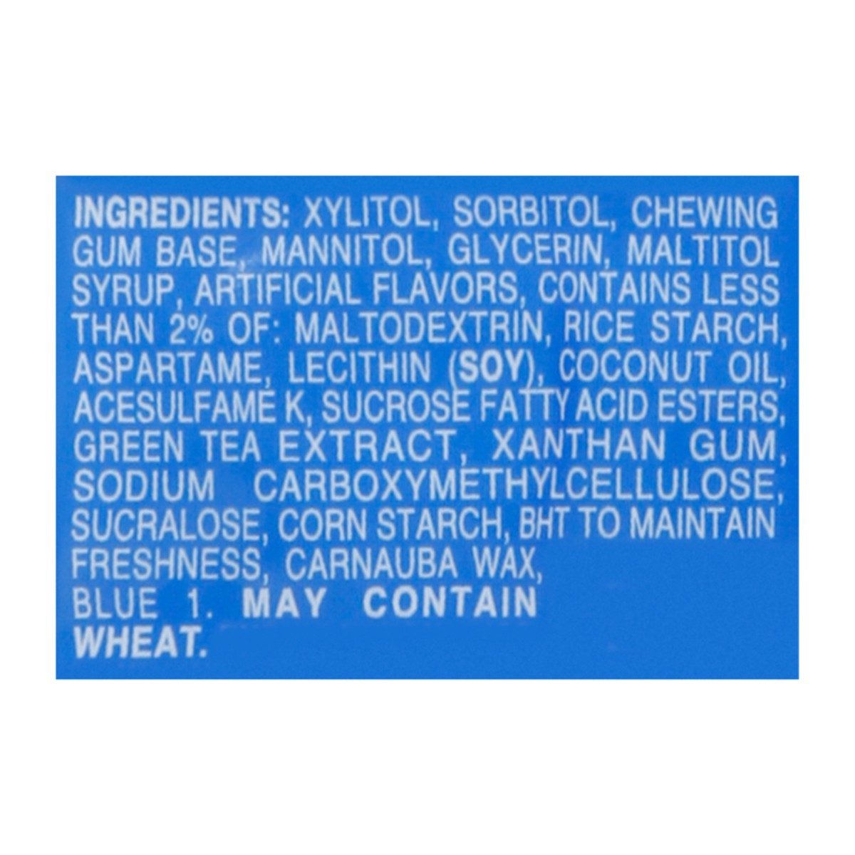 Xylitol, Sorbitol, Chewing Gum Base, Mannitol, Glycerin, Maltitol Syrup, Artificial Flavors, Contains Less than 2% of: Maltodextrin, Rice Starch, Aspartame, Lecithin (Soy), Coconut Oil, Acesulfame K, …