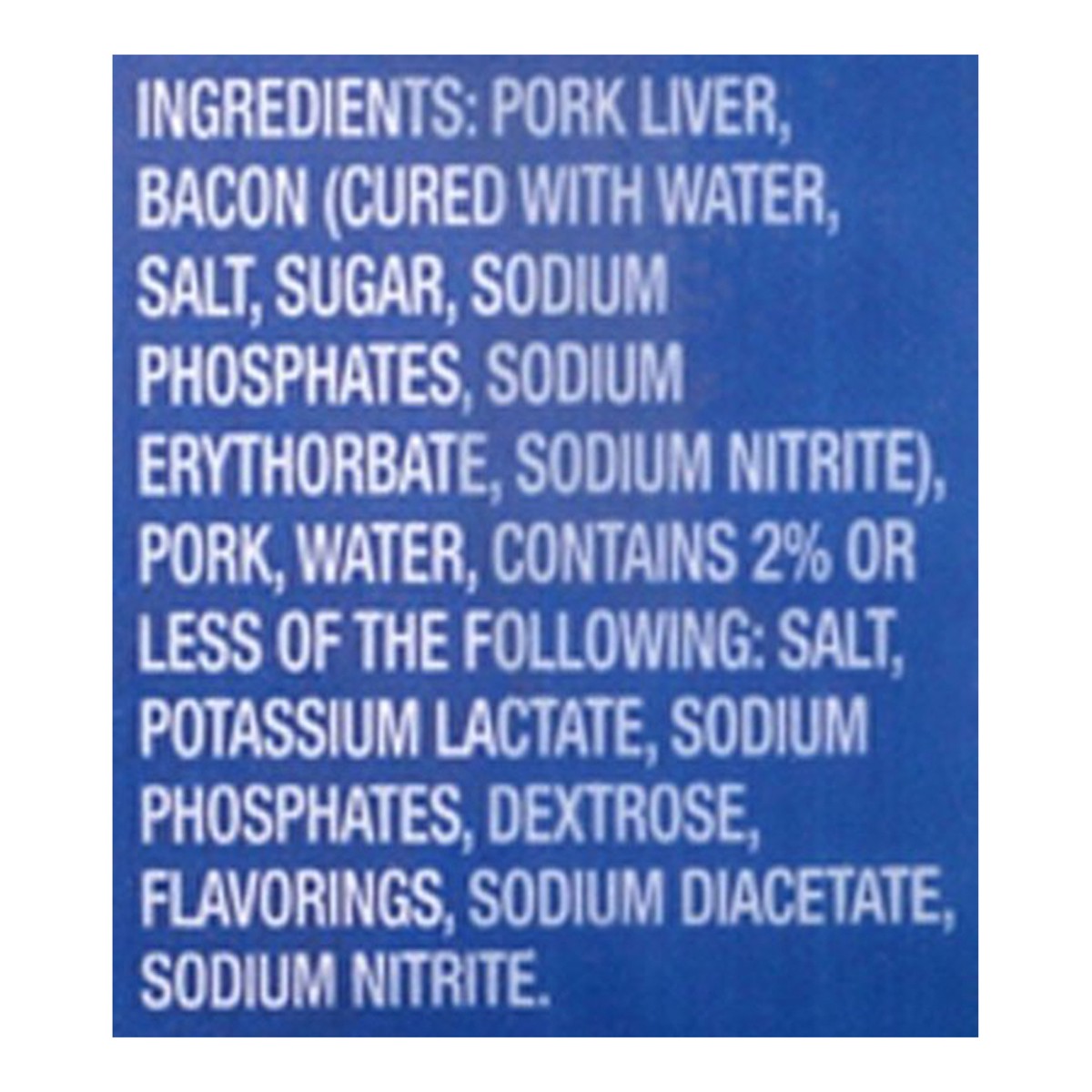 Pork Liver, Bacon (Cured with Water, Salt, Sugar, Sodium Phosphates, Sodium Erythorbate, Sodium Nitrite), Pork, Water, Contains 2% or Less of the Following: Salt, Potassium Lactate, Sodium Phosphates,…