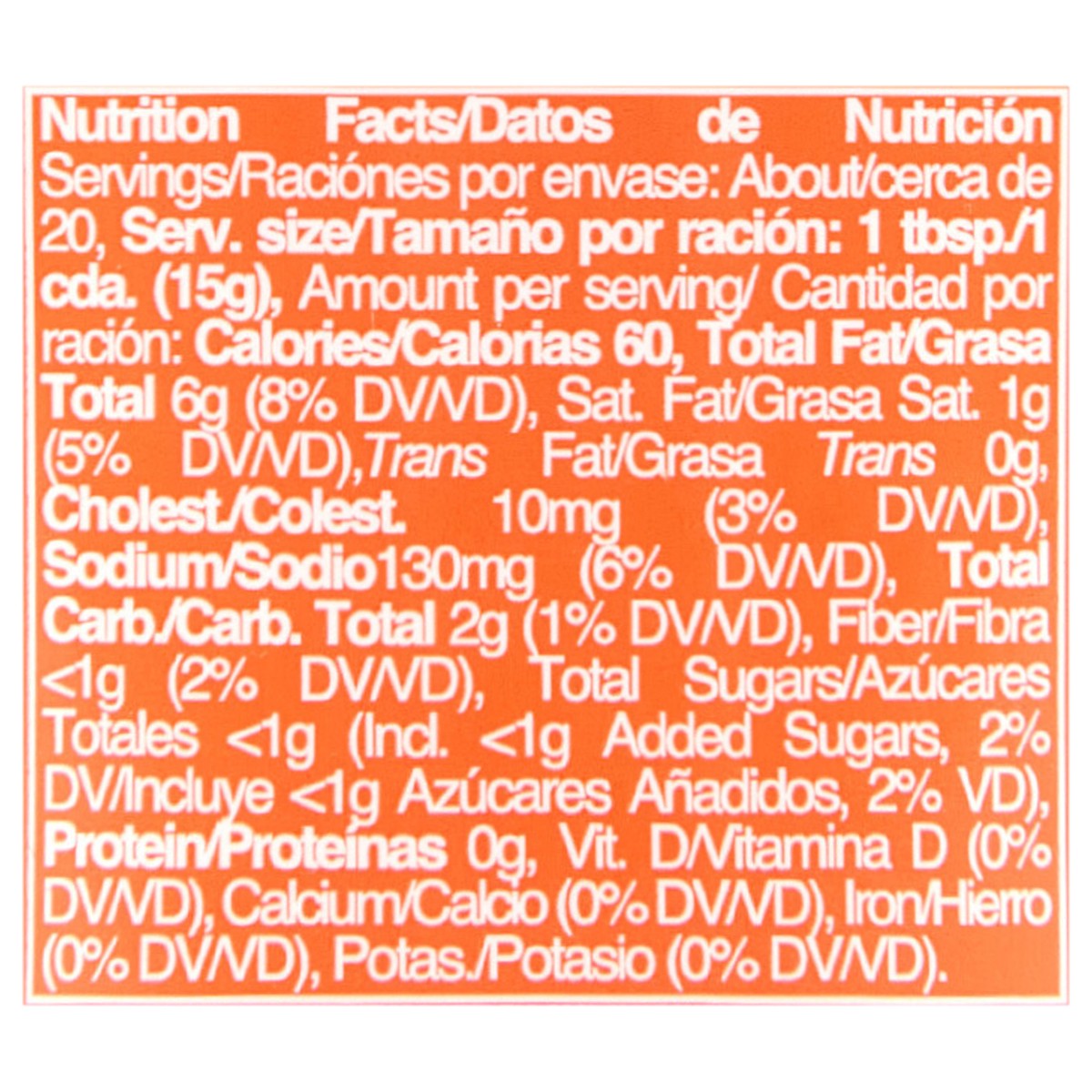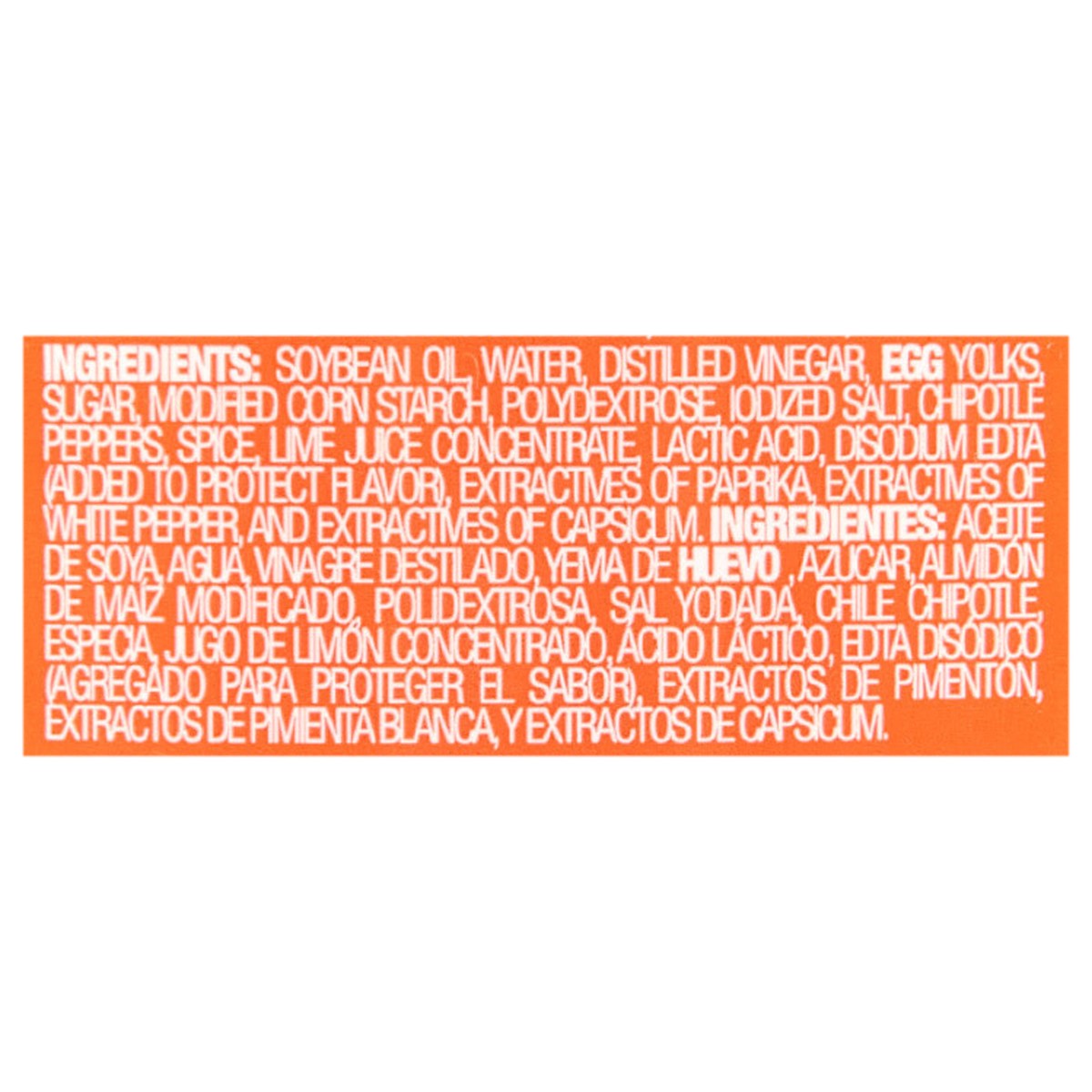 Soybean Oil, Water, Distilled Vinegar, Egg Yolks Sugar, Modified Corn Starch, Polydextrose, Iodized Salt, Chipotle Peppers, Spice, Live Juice Concentrate Lactic Acid, Disodium EDTA Added to Protect Fl…